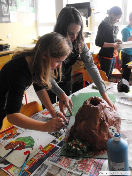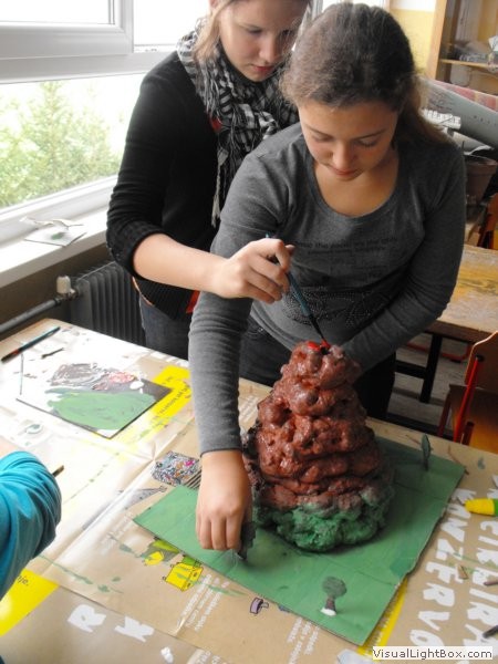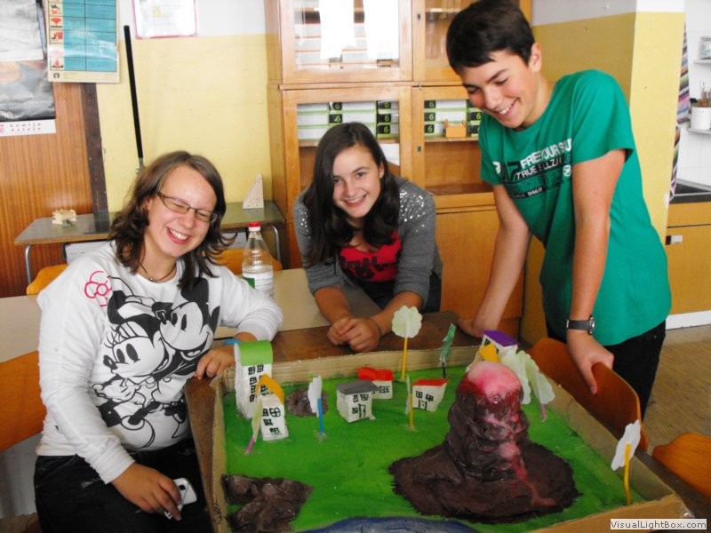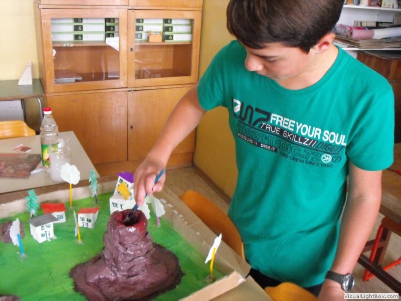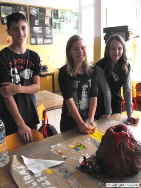 24. oktobra 2012 smo učenci 7. razreda izdelovali vulkane iz različnih materialov. Razdelili smo se v tri skupine in začeli izdelovati vulkan iz različnih materialov. Prva skupina je izdelala vulkan iz časopisa, druga iz das mase in tretja iz trde pene. Vsak vulkan je imel zeleno podlogo iz trdega kartona. V prvi šolski uri smo naredili obliko vulkana, ki smo ga nato prebarvali z mnogoterimi odtenki različnih barv, da bi res bil kakor resnični in okrasili njegovo okolico. Nato smo izvedli eksperiment. V prazno plastenko, ki je bila v vulkanu, smo vlili kis, milnico in rdečo barvo ter dodali še pecilni prašek. Penasta tekočina, ki bi ji lahko rekli lava, je izbruhnila iz vulkana in počasi stekla po njem do tal. Pri izdelovanju smo se zabavali, najbolj zanimivo od vsega nam je bilo opazovati izbruh vulkana.