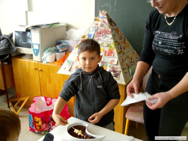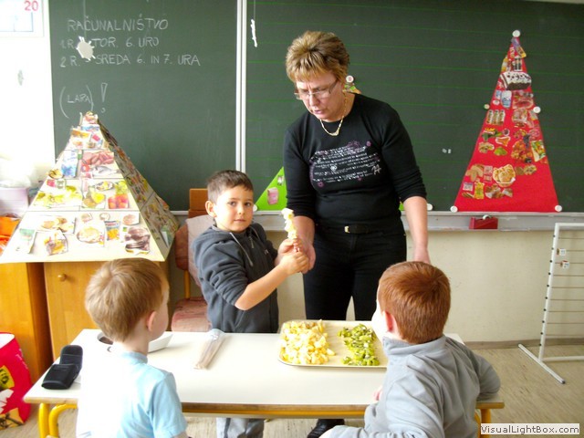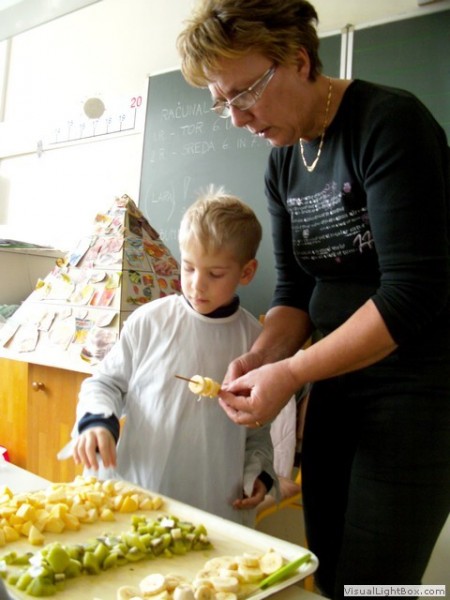 V petek, 17. 2. 2012, smo imeli učenci 1. in 2. razreda naravoslovni dan o zdravi prehrani. Pogovarjali smo se o zdravi, manj zdravi in nezdravi hrani. Svoje vtise smo prenesli na prehrambeni piramidi, ki smo jo izdelovali v dveh skupinah. Zadnji dve uri so se učenci preizkusili v pripravi sadnega napitka in nabodala. Najbolj so uživali ob pokušini svojih izdelkov. Učenci so dobili recept za pripravo le-teh in domačo nalogo, da to še enkrat ponovijo doma.