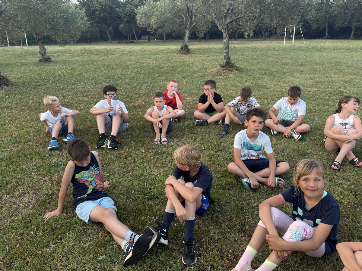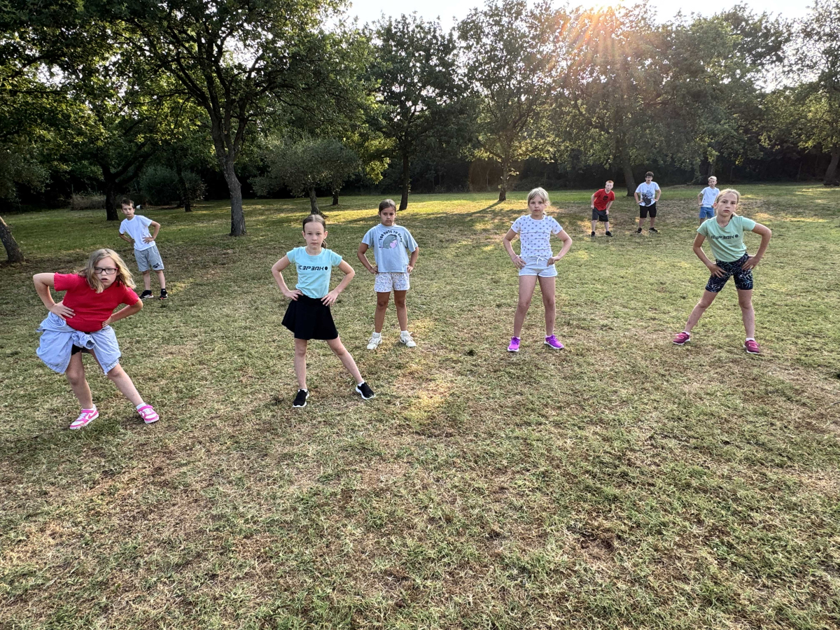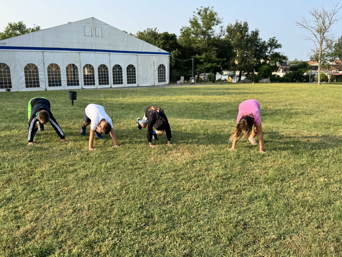 Naš teden se izteka. Na predzadnji dan tega tedna smo se še težje zbudili kot na dan prej. Kljub temu nekaj učencev uspe priti prej do kopalnice in se umiti, urediti, večinoma pa otroci uspejo le pižamo dati s sebe in se leno premakniti s prvega nadstropja na travnato površino pred domom. Medtem ko eni tečejo, drugi začnejo s hojo, saj na pol še spijo. Pri razteznih vajah pa se končno le prebudijo še tisti najbolj zaspani.