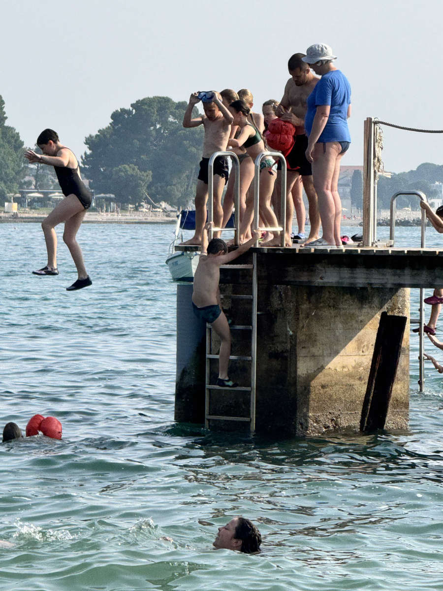 Po telovadbi je sledilo umivanje, pospravljanje sob in seveda ocenjevanje le-teh. Za tem smo se odpravili na plažo. Danes je bilo še nekaj tistih učencev, ki so se odločili svoj dosežek izboljšati, tako smo dobili skupno kar 14 zlatih delfinčkov. Ostali pa so prosto plavali pod nadzorom učiteljev, se igrali in zabavali v vodi z maskami, si podajali žogico ali pa se kartali v globoki senci.