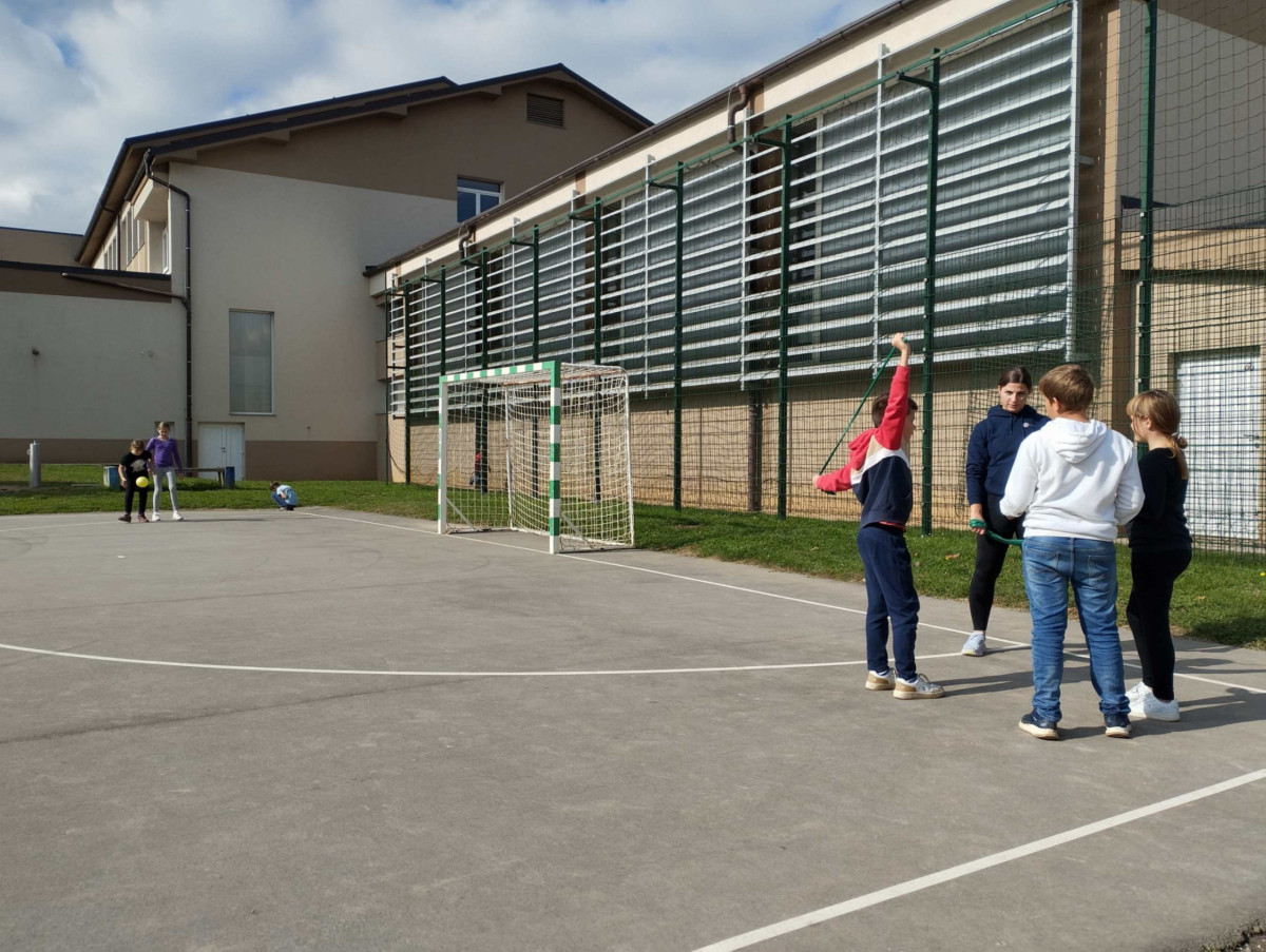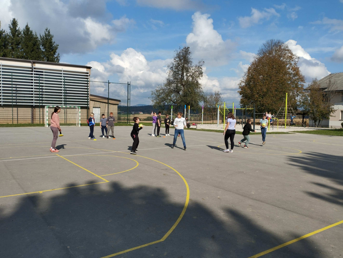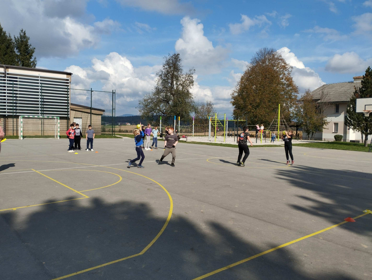 Po predavanju smo šli ven. Najprej smo se ogreli. Nato smo izvajali različne vaje za krepitev mišic z žogo, elastiko in palico. Nato smo imeli štafetno tekmovanje. Ob koncu dneva smo se igrali med dvema ognjema.
