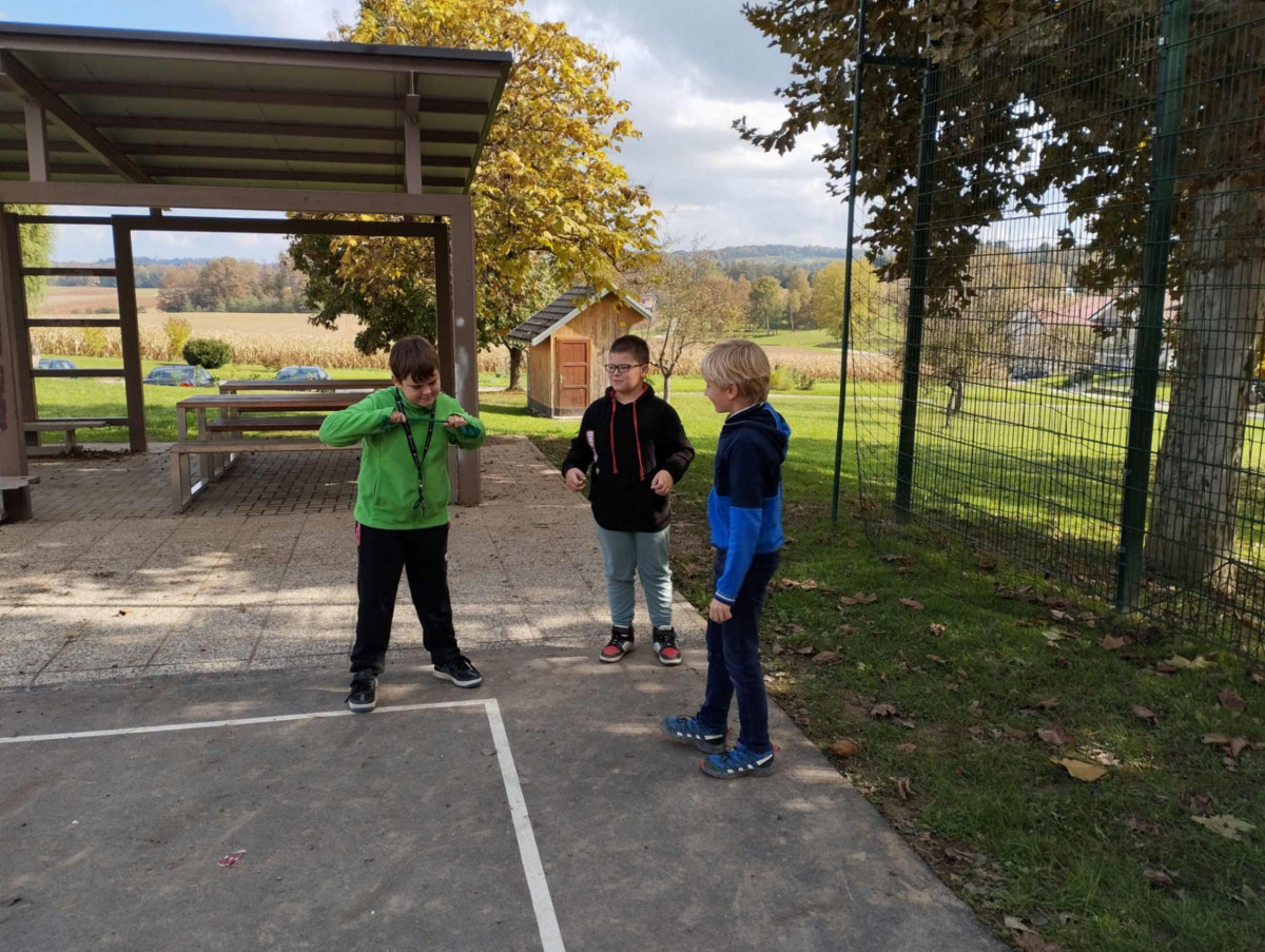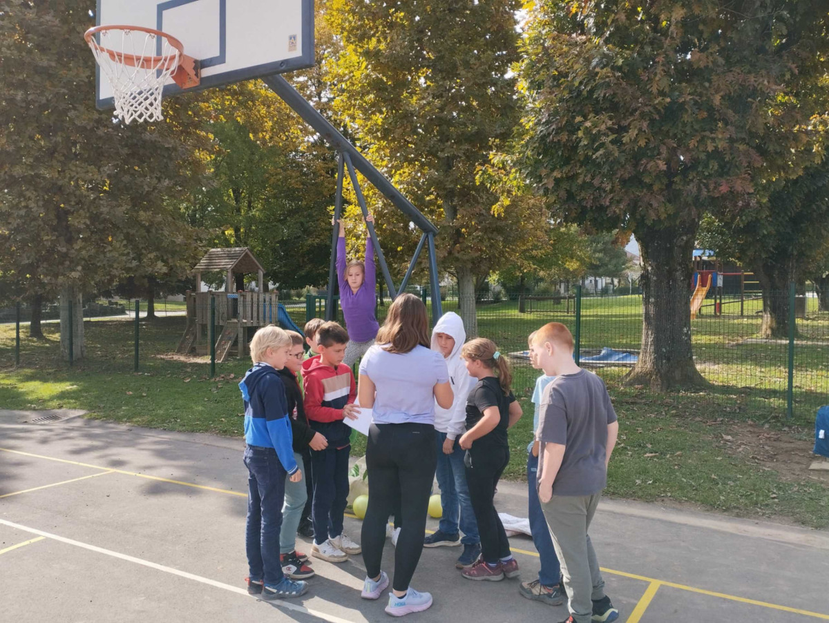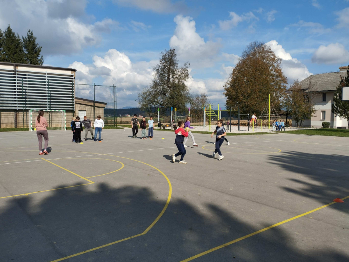 Po predavanju smo šli ven. Najprej smo se ogreli. Nato smo izvajali različne vaje za krepitev mišic z žogo, elastiko in palico. Nato smo imeli štafetno tekmovanje. Ob koncu dneva smo se igrali med dvema ognjema.