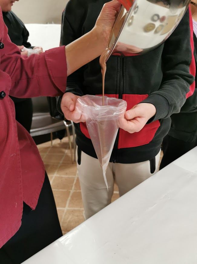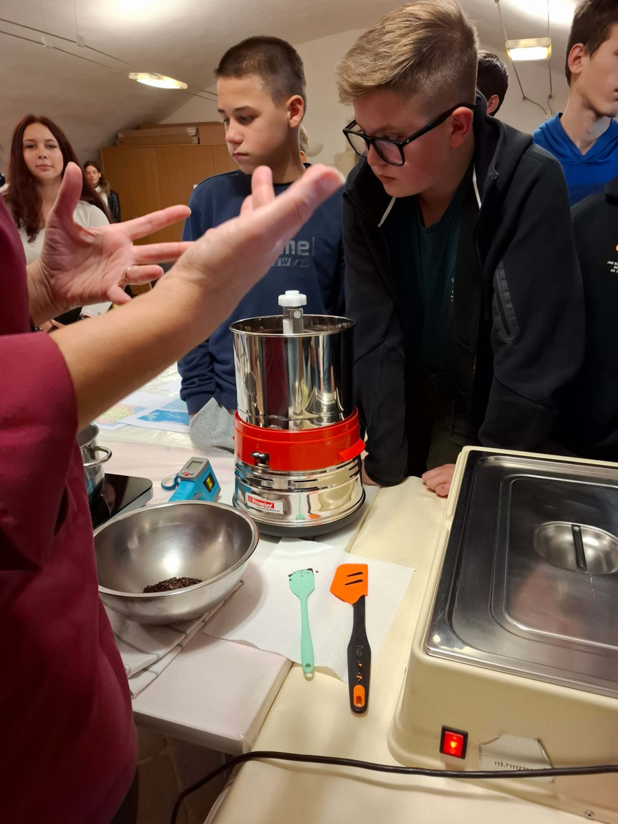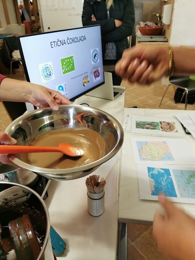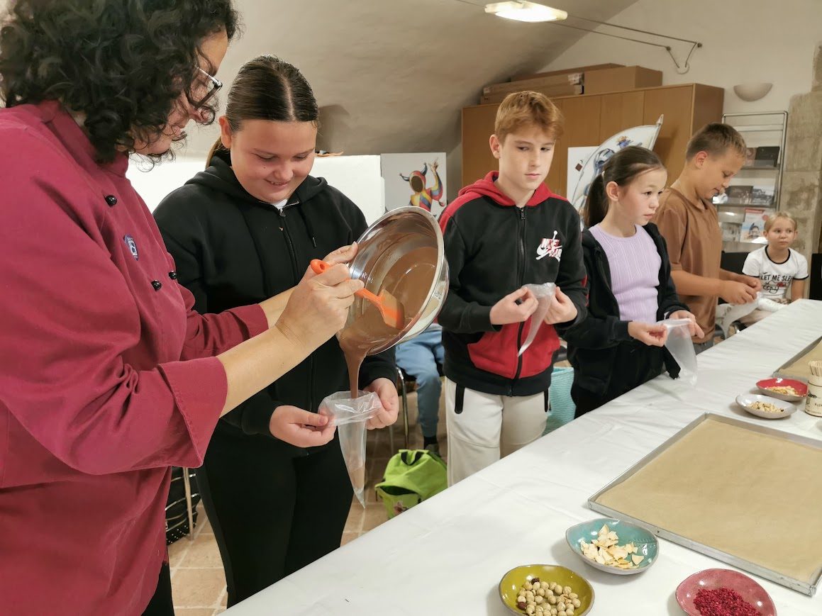 Zjutraj smo se zbrali v šoli in si vzeli malico. Nato smo počakali avtobus in se vkrcali. Pot do Krškega je bila kar dolga, a nam ni bilo dolgčas, ker smo opazovali čudovite pokrajine. Ustavili smo se na prvi postaji, ki je bil grad Rajhenburg v Brestanici pri Krškem. Razdelili smo se v dve skupini. Učenci 6. in 7. razreda smo najprej na delavnici čokolade izvedeli vse o izvoru čokolade, vrstah čokolade, si ogledali kako se čokolada izdela, nato pa smo si naredili svoje čokoladne lizike in si jih poljubno okrasili. Lizike so bile zelo okusne…