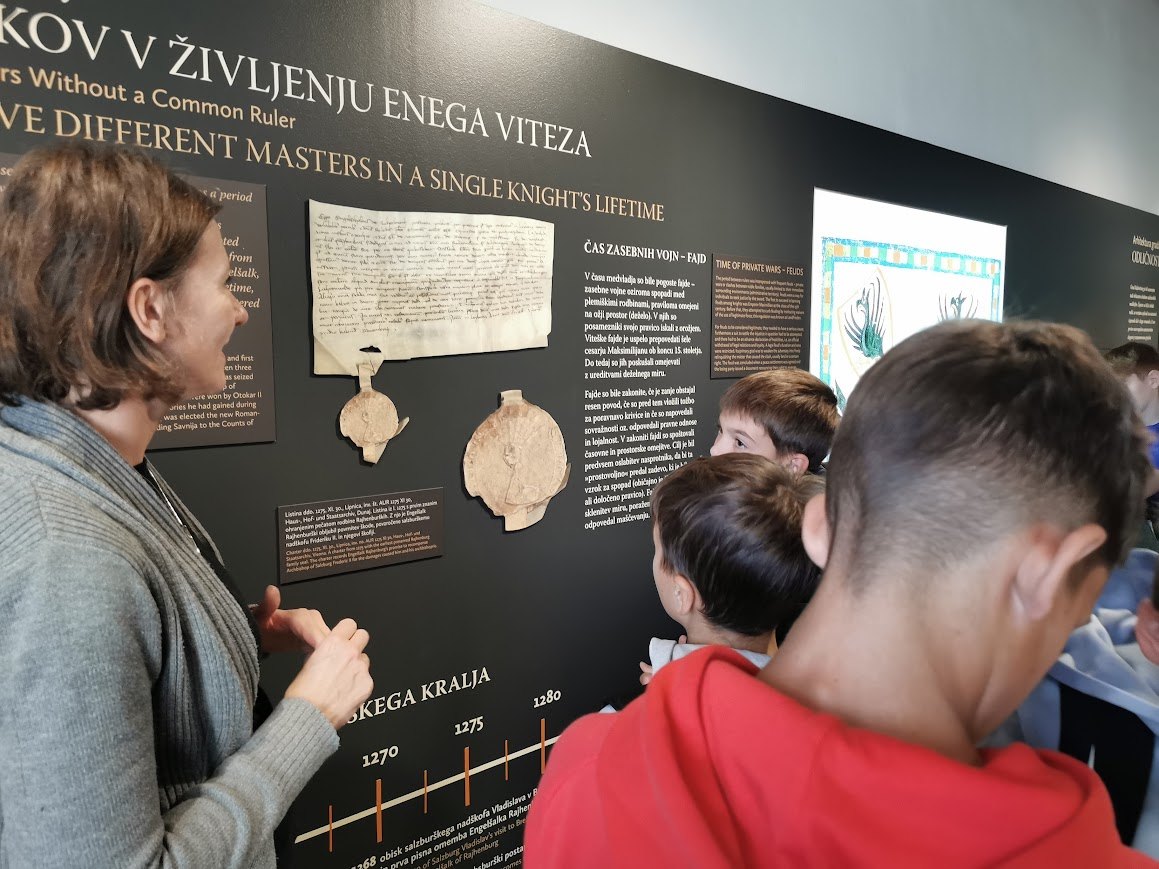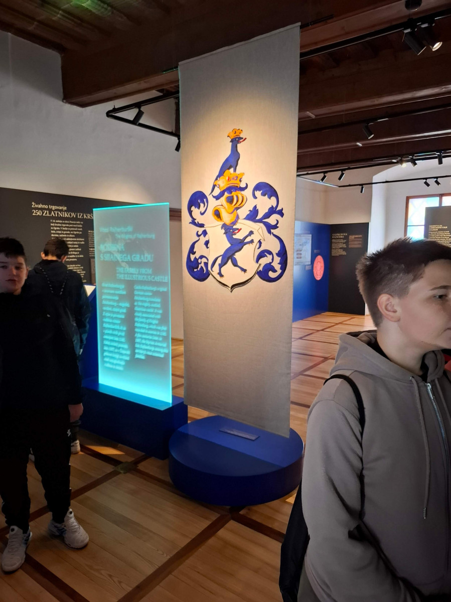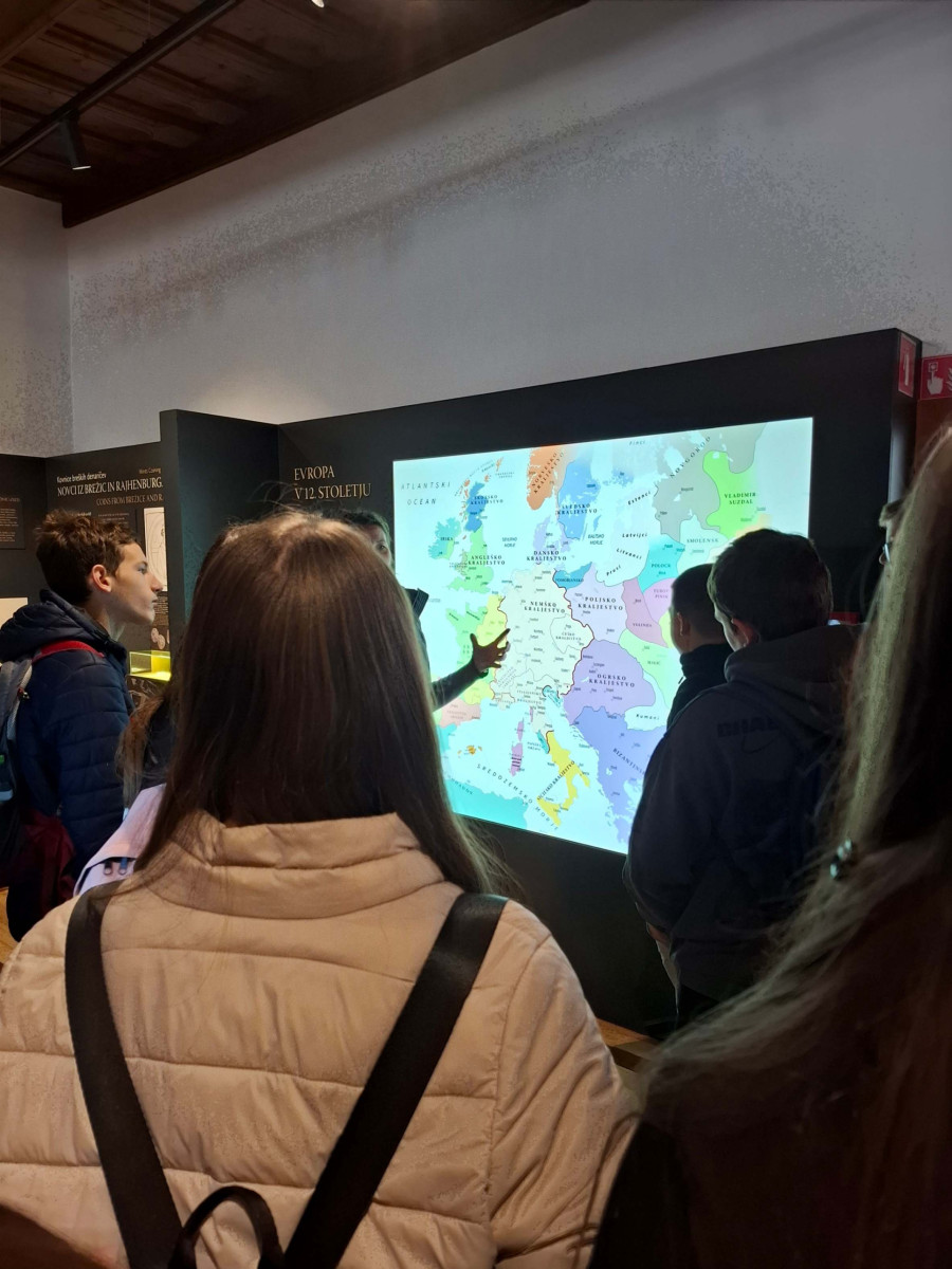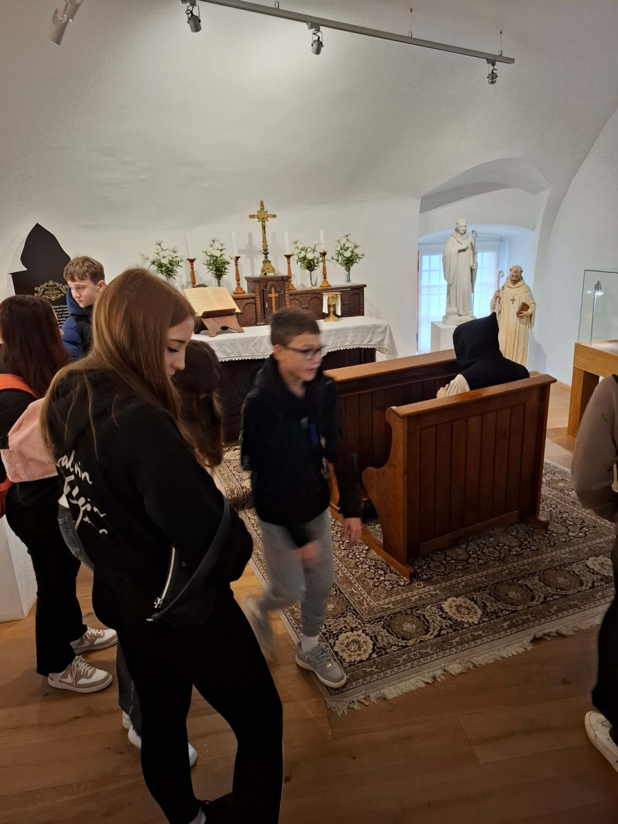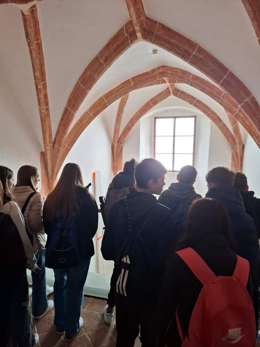 Nato smo se skupini zamenjali, mi smo šli na ogled gradu, 8. razred pa na ogled izdelave čokolade. V gradu je bilo veliko zanimivih slik. Gospa kustosinja nam je povedala o menihih, ki so živeli v zelo majhnih sobicah in cel dan molili. Nato smo imeli delavnico kaligrafije, kjer smo pisali s posebnimi peresi. Naučili smo se napisati svoje ime in priimek s srednjeveško pisavo karolinško minuskulo. Poslovili smo se in se odpeljali na pico in potem odšli na karting stezo.