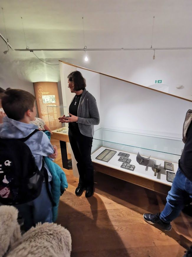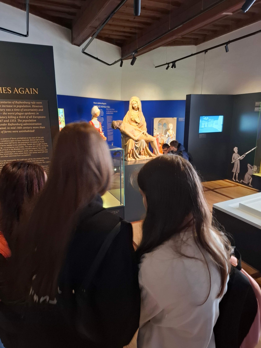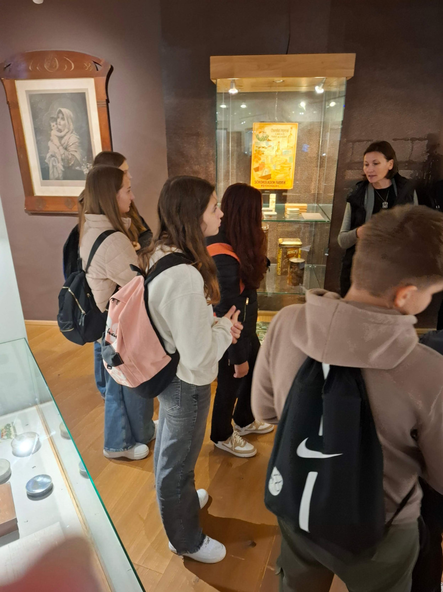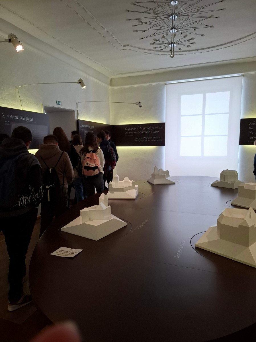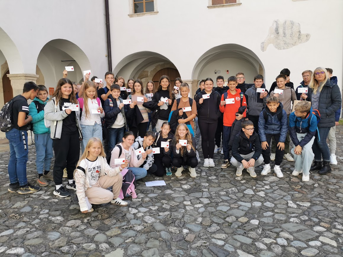 Nato smo se skupini zamenjali, mi smo šli na ogled gradu, 8. razred pa na ogled izdelave čokolade. V gradu je bilo veliko zanimivih slik. Gospa kustosinja nam je povedala o menihih, ki so živeli v zelo majhnih sobicah in cel dan molili. Nato smo imeli delavnico kaligrafije, kjer smo pisali s posebnimi peresi. Naučili smo se napisati svoje ime in priimek s srednjeveško pisavo karolinško minuskulo. Poslovili smo se in se odpeljali na pico in potem odšli na karting stezo.