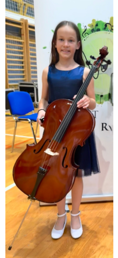 Tekmovanja se je udeležila tudi učenka naše šole Tia Dajčman (4. r.), učenka 3. r. Glasbene šole Črnomelj. Z igranjem na čelo si je s pesmima Sanja Repše: Končertino št.1 v C – duru (za Uršo) in J. S. Bach: Menuet št. 3 v C – duru ZLATO PRIZNANJE. Na tekmovanje jo je pripravljala njena učiteljica Jerina Lokmer, na klavir pa jo je spremljal g. Andrej Kunič.