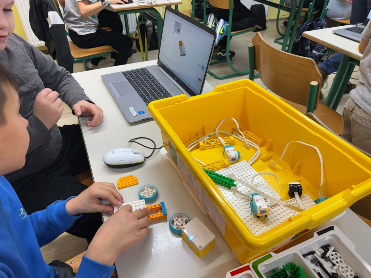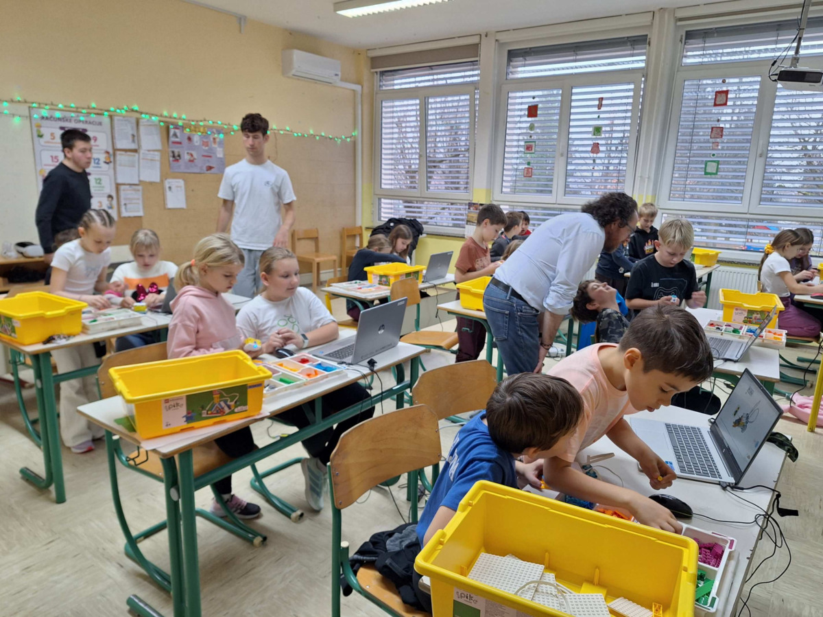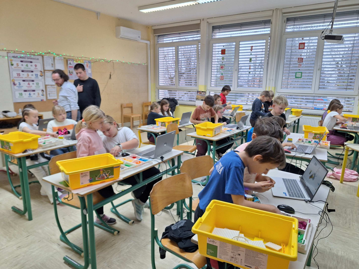 Danes, 3. 12 .2025, smo imeli dve šolski uri tehniški dan na temo robotike. Po malici smo odšli v učilnico 5. razreda. Tam sta nas pričakala dva fanta iz srednje računalniške šole ter učitelj robotike. Posedli smo se po dva za eno klop. Na klopeh so bili računalniki ter škatle lego kock za robotiko. Na računalniku smo imeli aplikacijo Scratch, na katero smo kliknili in pričeli z delom. Naredili smo nekaj preizkusov, v katerih smo spoznali, kako se uporabljajo stvari.