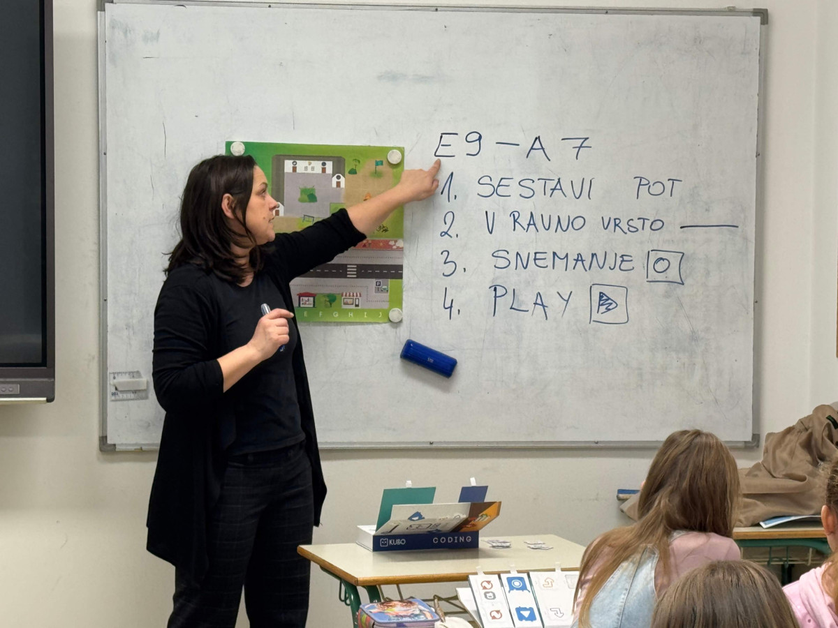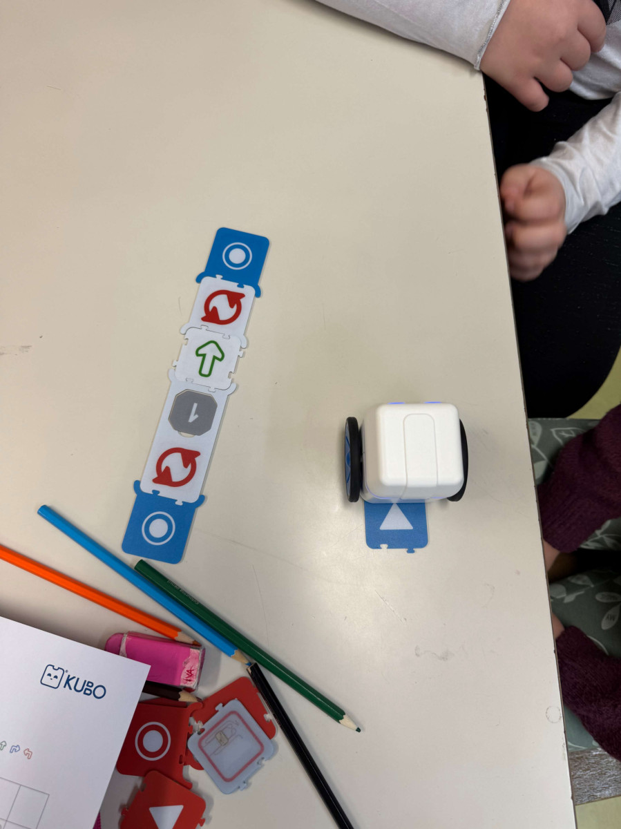 Potem smo spoznali KUBO robotke. Ga Polona nam je pokazala, kako delujejo. Z njimi smo začeli tako, da smo jih premikali iz točke A do točke B. Uporabljali smo kartice, ki so robotu povedale, kam naj gre. Na začetku ni vedno šlo prav, zato smo morali poskusiti večkrat in popraviti ukaze. To je bilo zabavno.