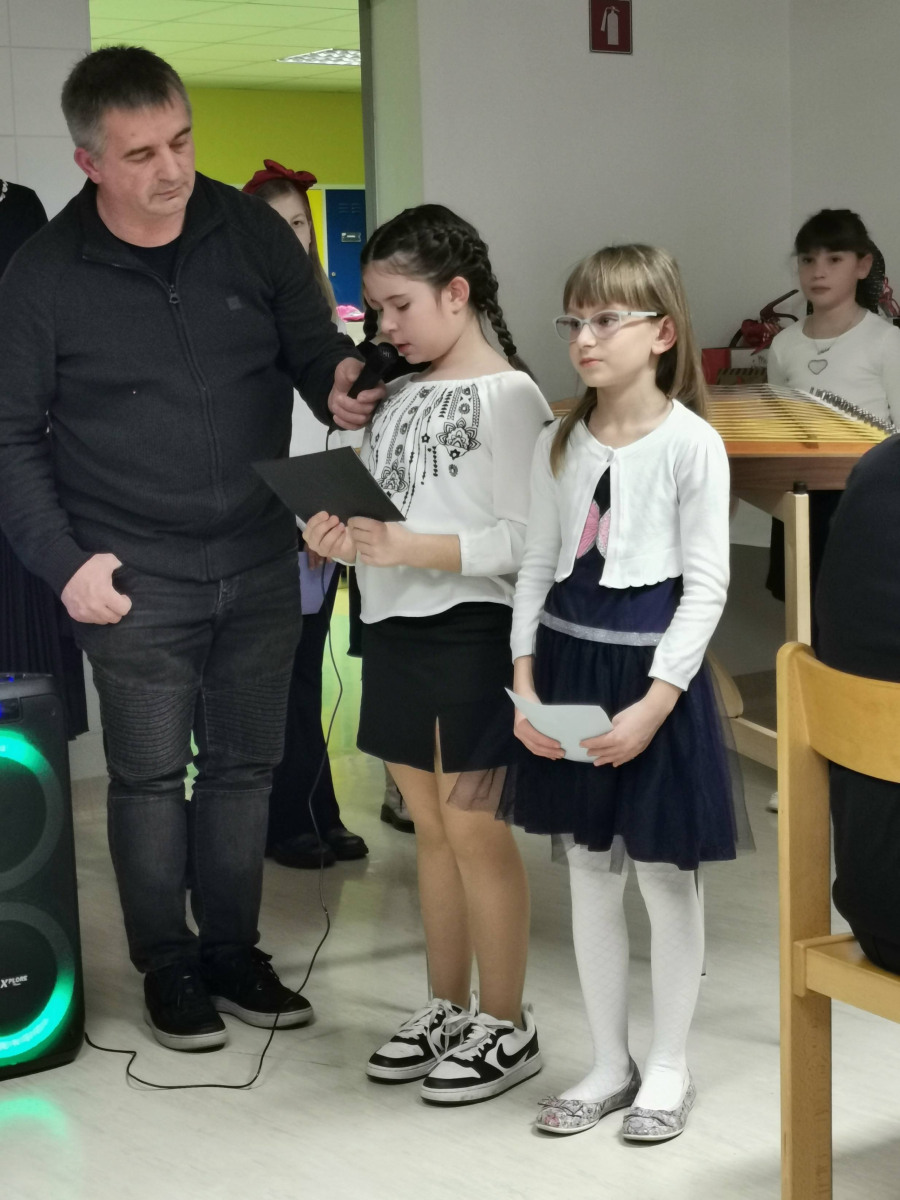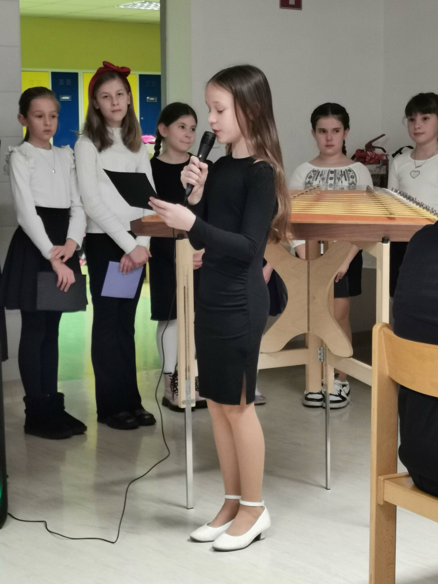 Za vse povabljene smo pripravili kratek kulturni program. Najprej je na oder stopila gospa ravnateljica in pozdravila vse zbrane. Nato pa smo se predstavile učenke Pevske skupine Krnica s pesmijo Trgaj mi rožice. Skupina deluje že pet let  in obiskujemo jo dekleta, ki imamo veselje  do ljudske glasbe. Po zapeti pesmi je nastopila Nuša Panjan z recitacijo pesmi Zvezdane Majhen Zima snežnogriva.