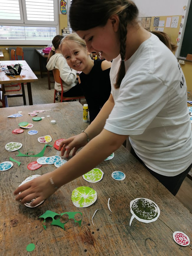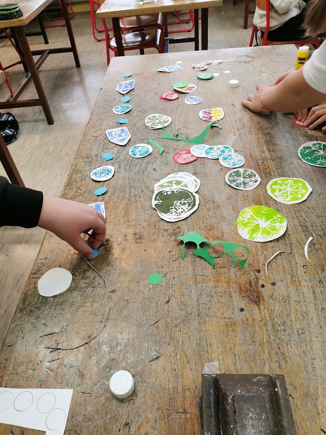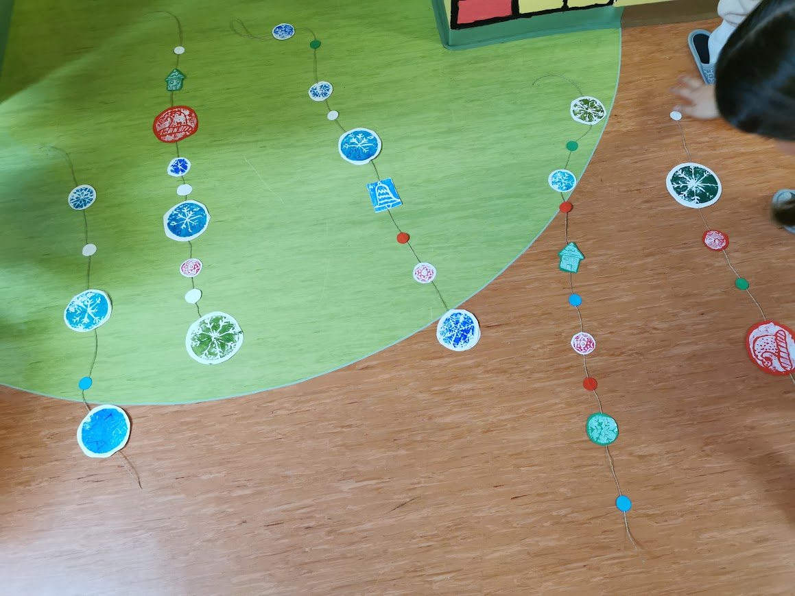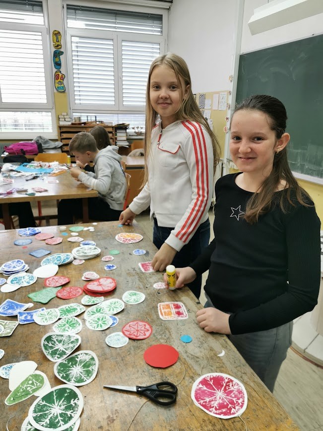 Najprej smo si pripravili grafike z različnimi motivi, kot so npr. smrekica, božični okrasek, zvonček in podobno. To smo naredili tako, da smo v matrico iz stirodurja vrisali motiv, ga premazali z barvo ter odtisnili na papir. Ko so se odtisi posušili, smo motive izrezali in jih nalepili na vrvico iz obeh strani. Tako smo naredili obešanko, ki zdaj krasi naša šolska okna, hodnike in jedilnico.