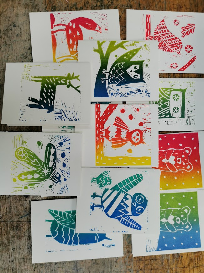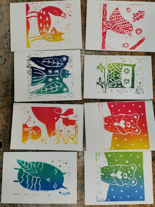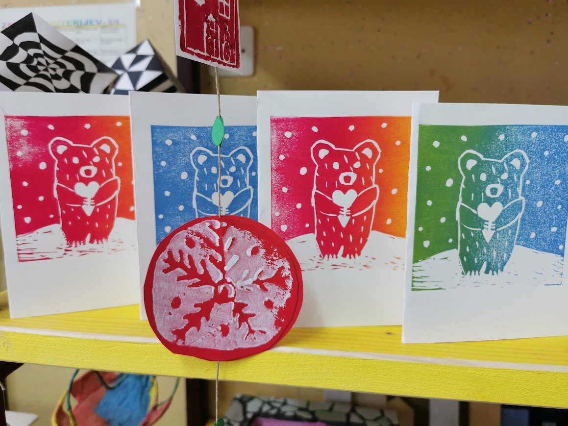 Pri likovni umetnosti smo izdelovali voščilnice. Izdelali smo jih v grafični tehniki linorez. Naši motivi pa so bile živali pozimi. Nastale so zelo ljubke voščilnice.