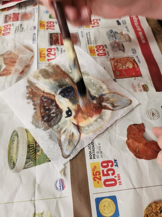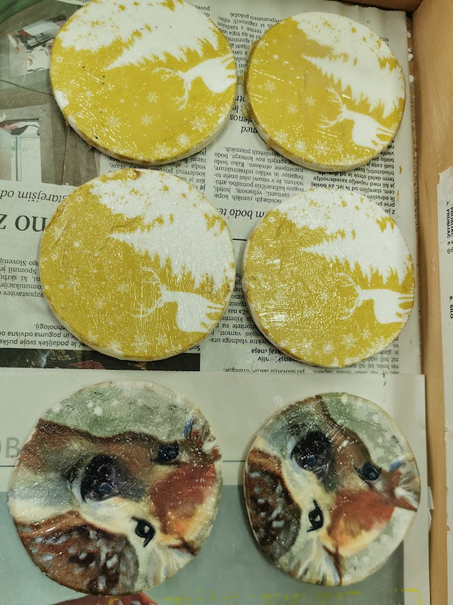 Iz lesa pa smo izdelovale tudi podstavke za skodelico. Te smo okrasile s servietno tehniko in z akrilnimi barvami. Poslikale smo jih z božično-novoletnimi motivi.