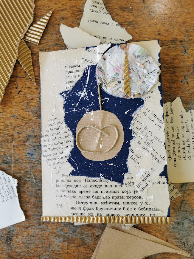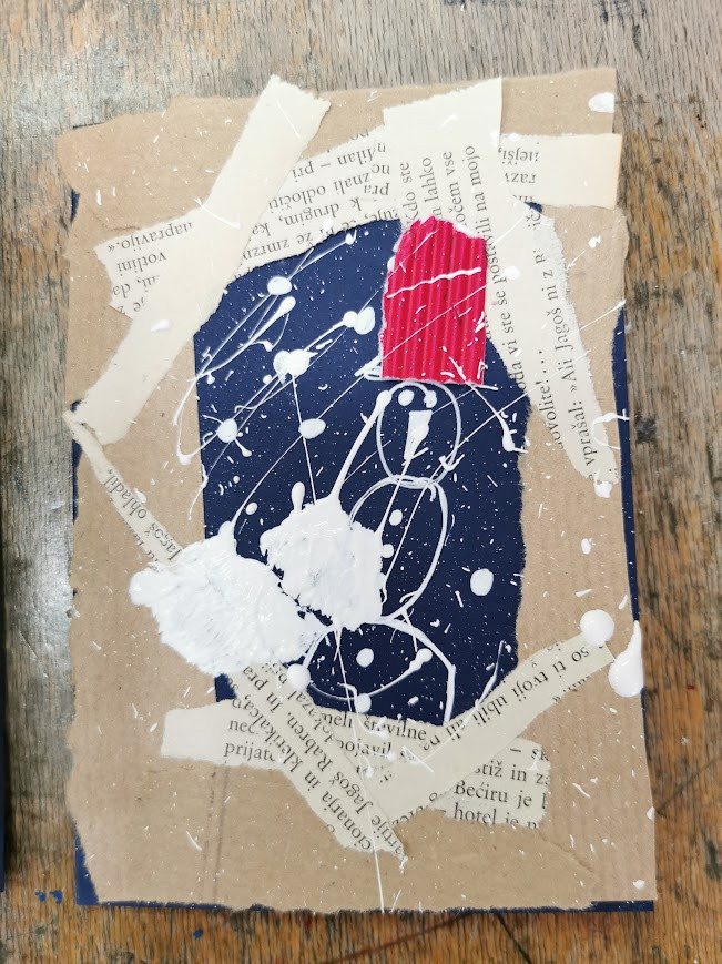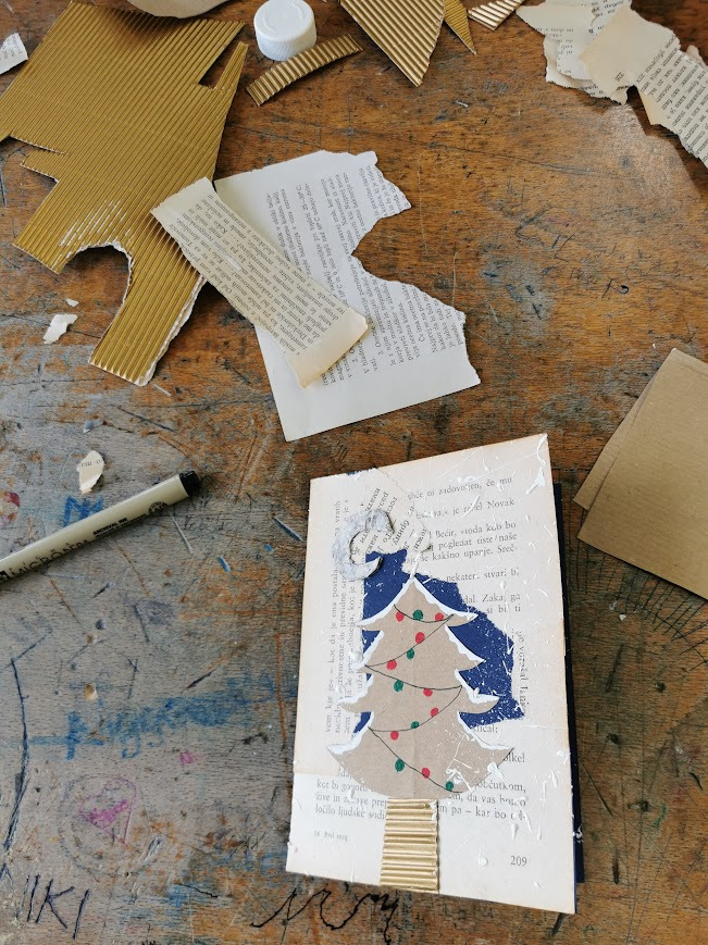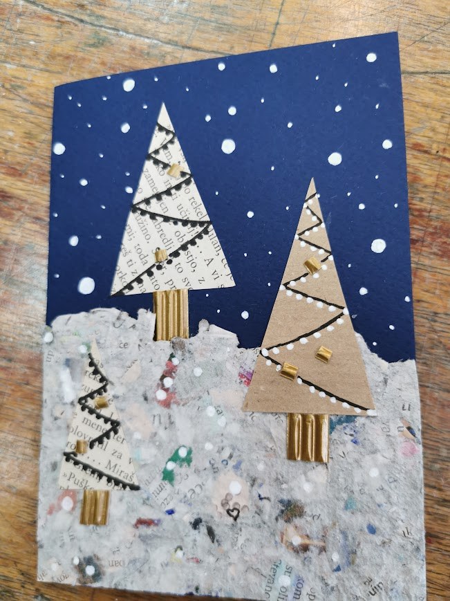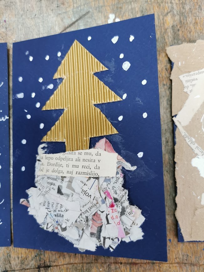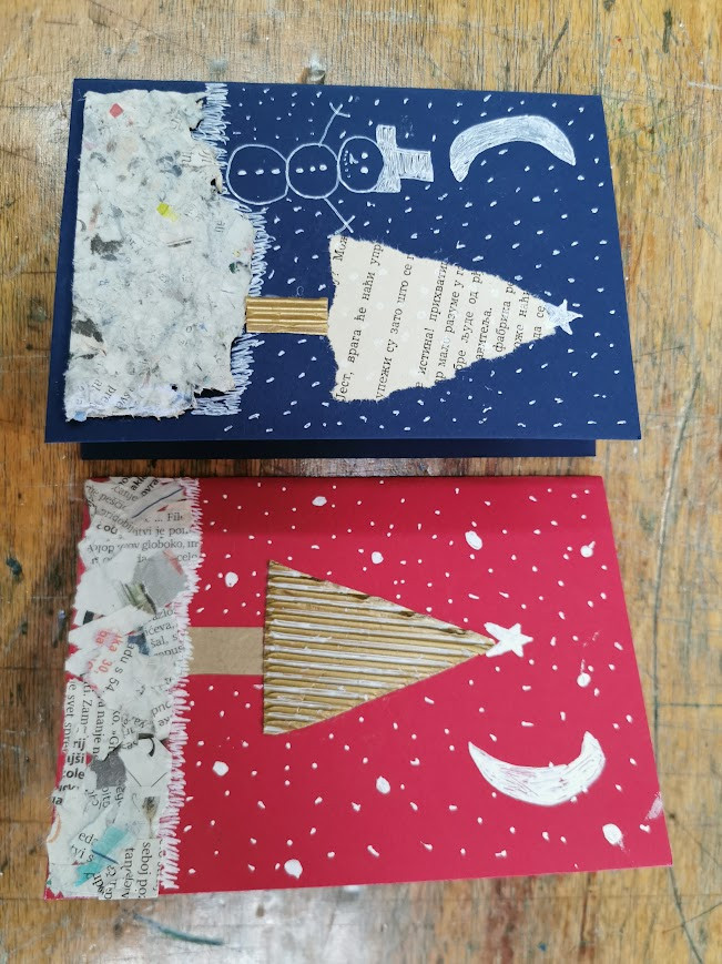 Za voščilnico smo uporabili moder ali rdeč papir in ga prepognili na pol. Prvo stran smo božično okrasili z uporabo različnih papirjev, belih in črnih flomastrov, tempera barv in recikliranega časopisnega papirja.
