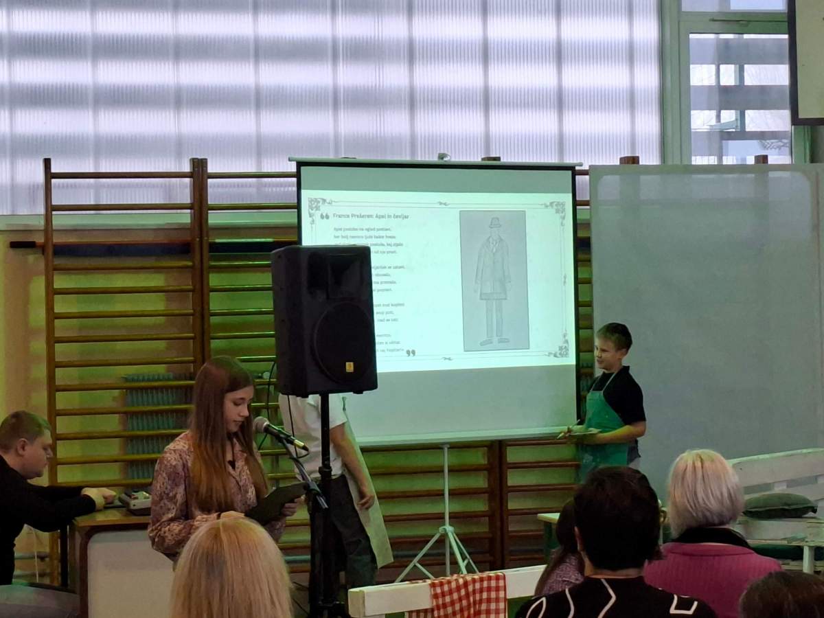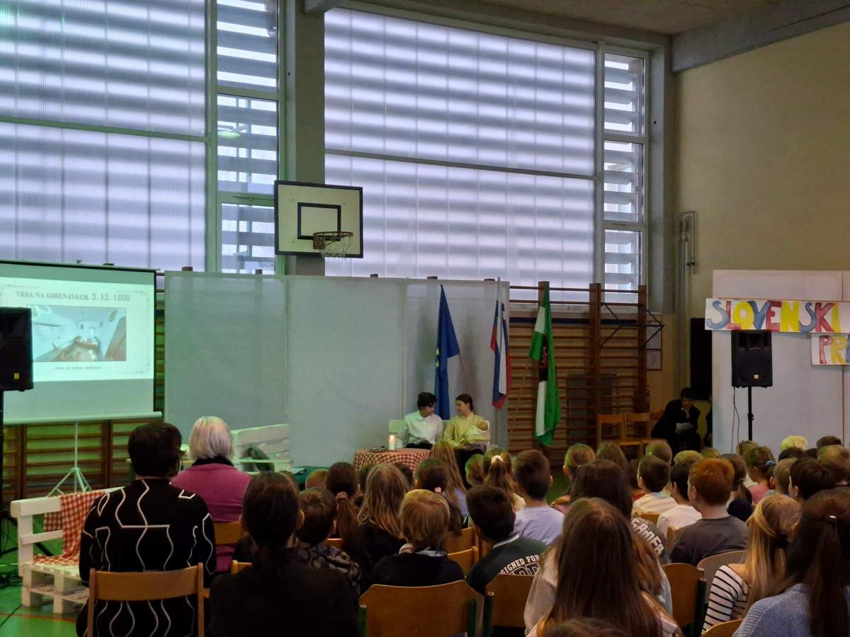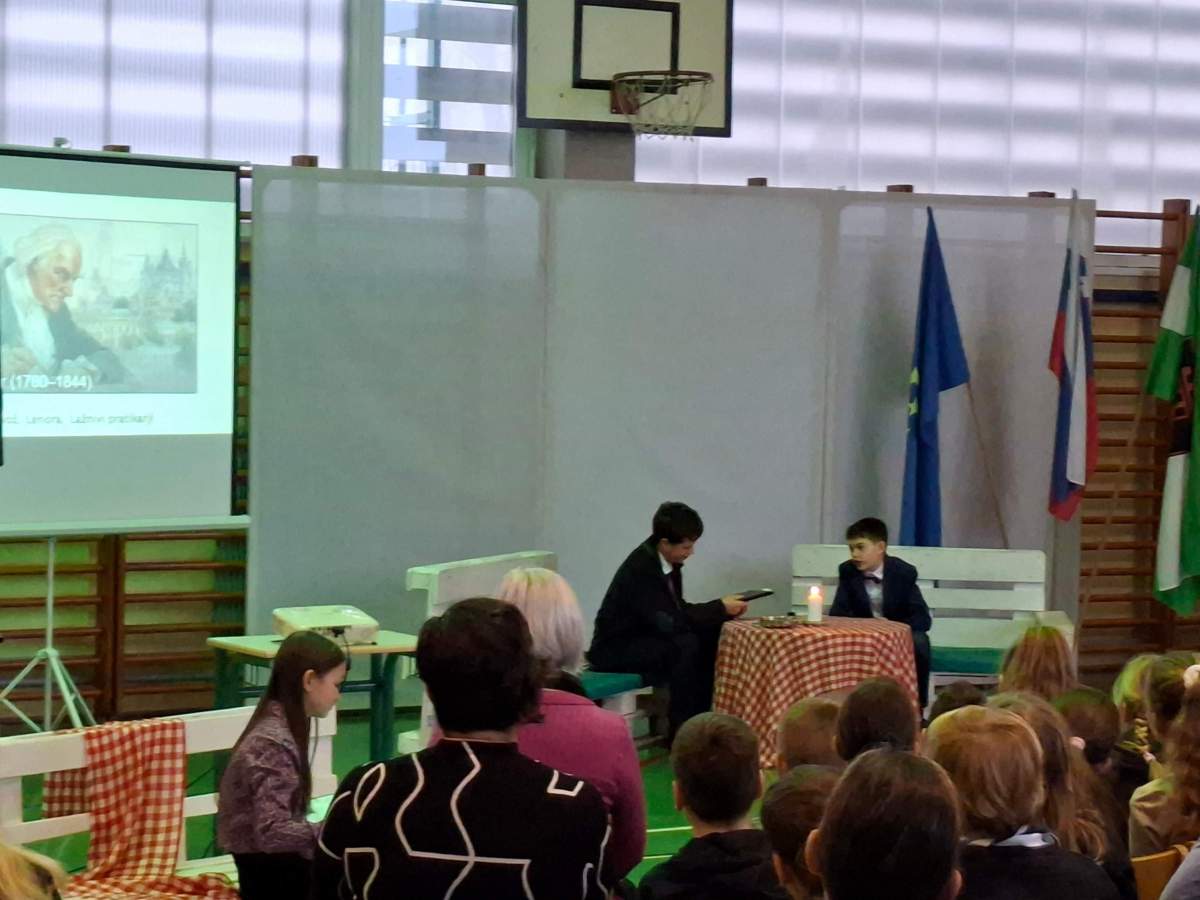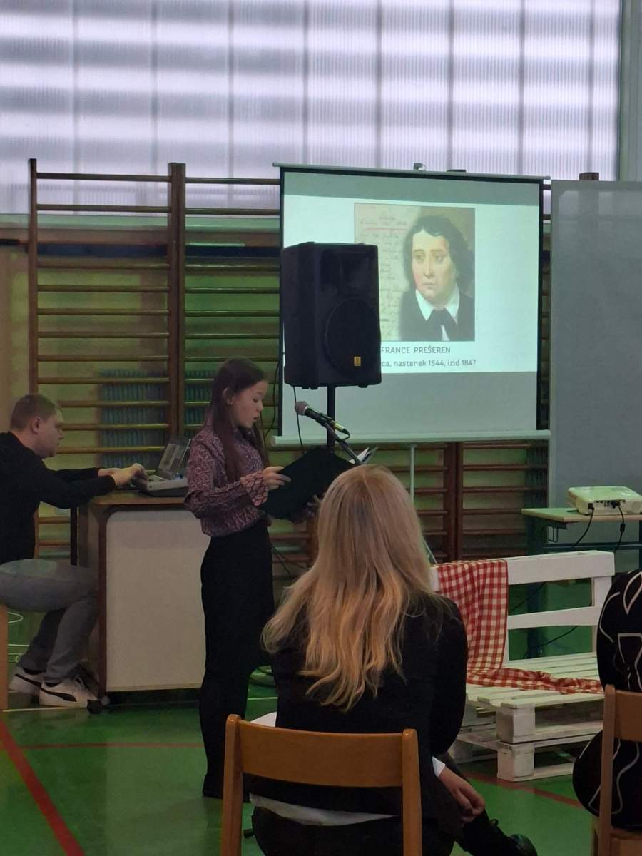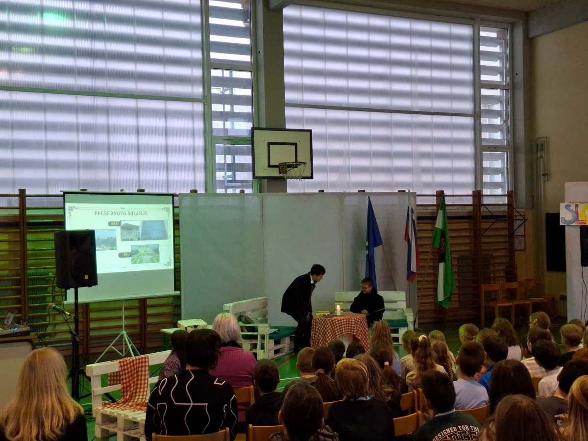 V petek, 6. februarja, je k nam prišel dr. France Prešeren. Za idejno zasnovo in organizacijo prireditve je poskrbela učiteljica Nataša Podhostnik, za sceno in kostume učitelj Žan Brozovič in učenci, za ozvočenje pa računalnikar Rok Mikšič.