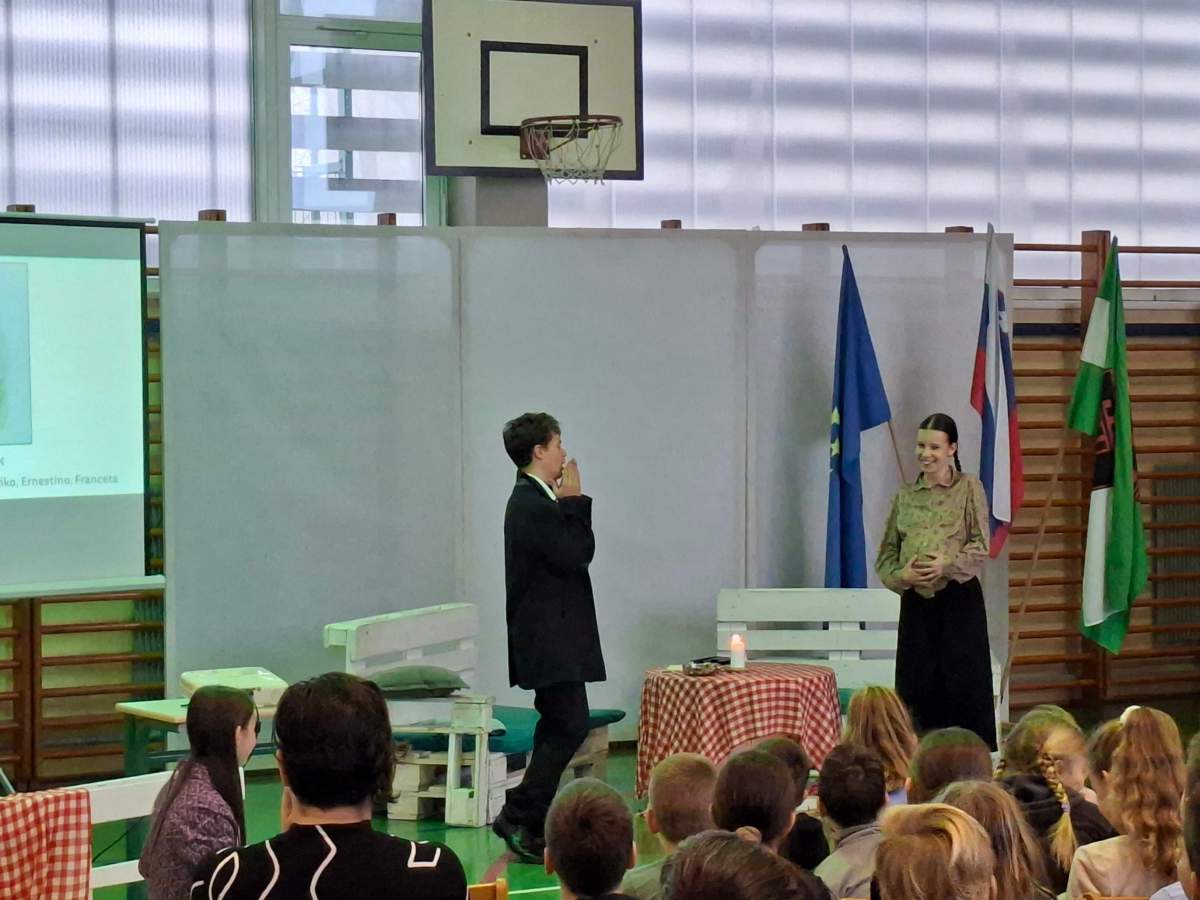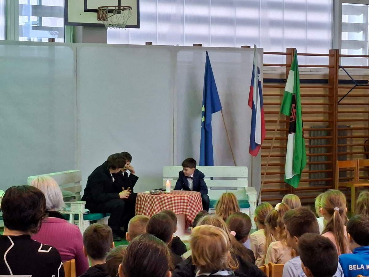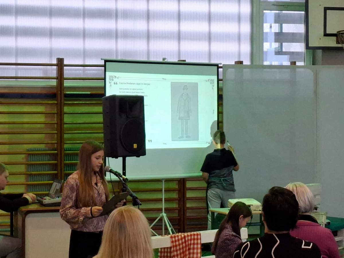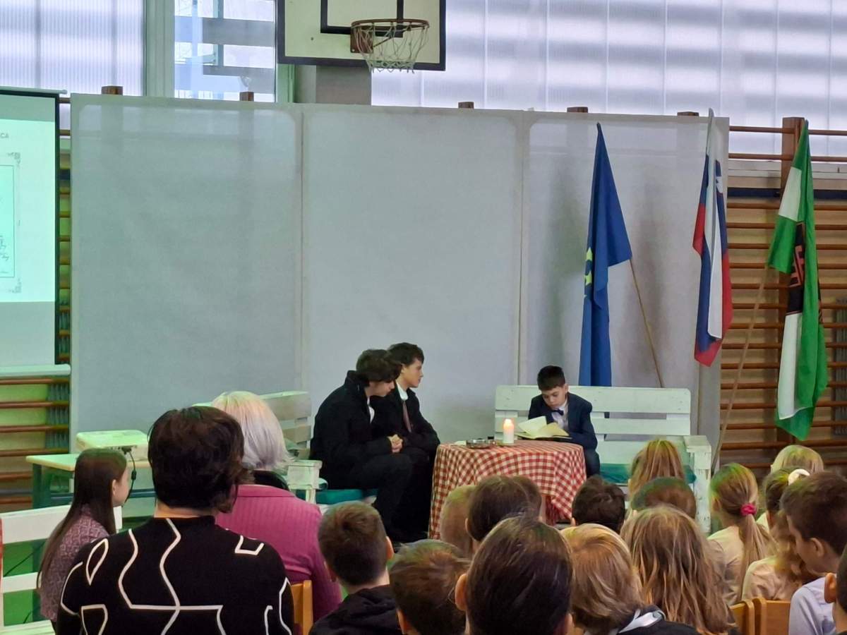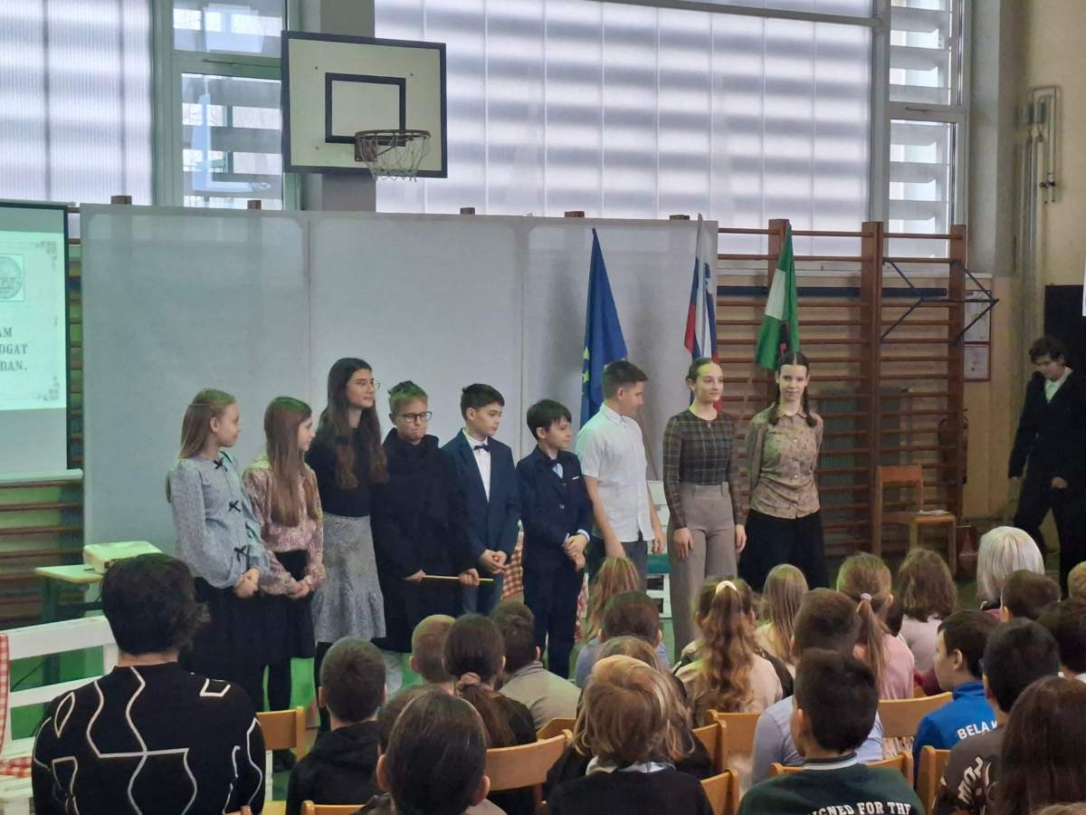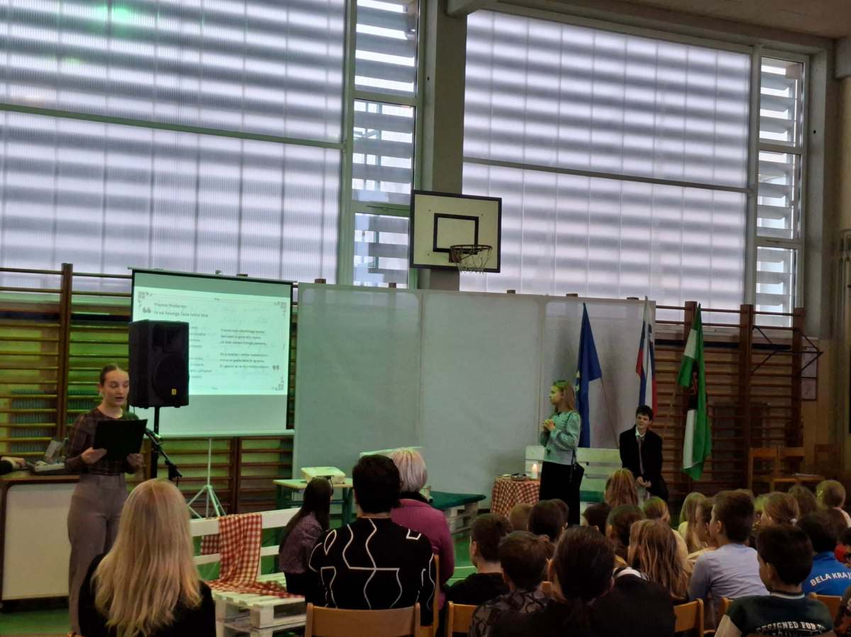 V petek, 6. februarja, je k nam prišel dr. France Prešeren. Za idejno zasnovo in organizacijo prireditve je poskrbela učiteljica Nataša Podhostnik, za sceno in kostume učitelj Žan Brozovič in učenci, za ozvočenje pa računalnikar Rok Mikšič.