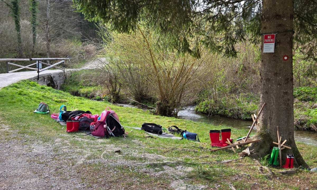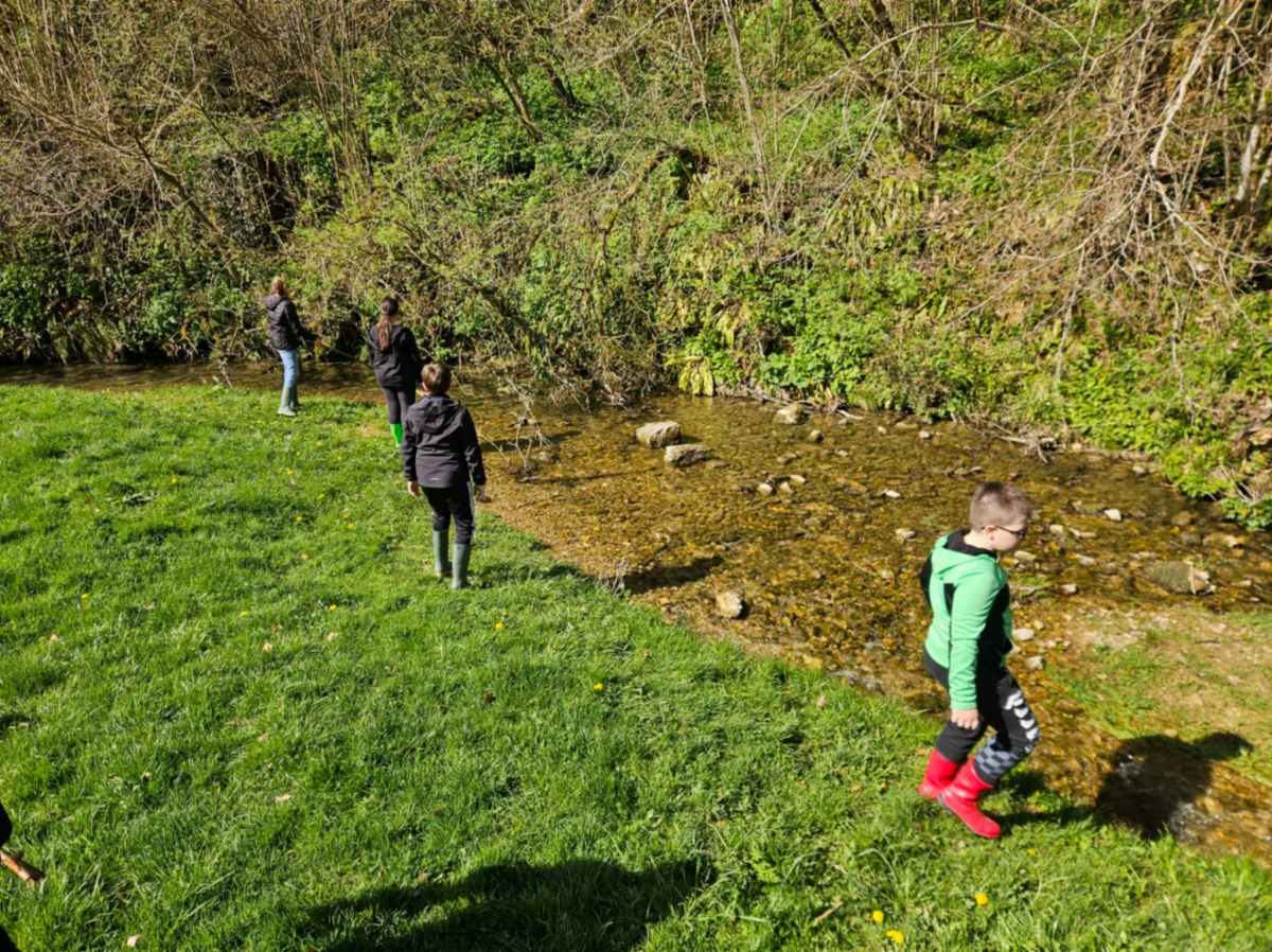 Po malici sta nam učiteljici razložili, kaj bomo počeli. Učenci 4. r. smo odšli s prvo učiteljico, učenci 5. razreda pa z drugo učiteljico. Ko smo dobili škornje, smo se odpravili do Divjega potoka. Preobuli smo se pri potoku.