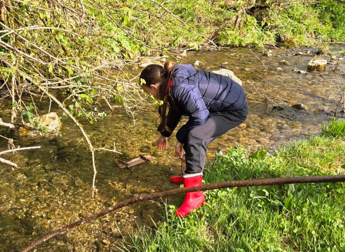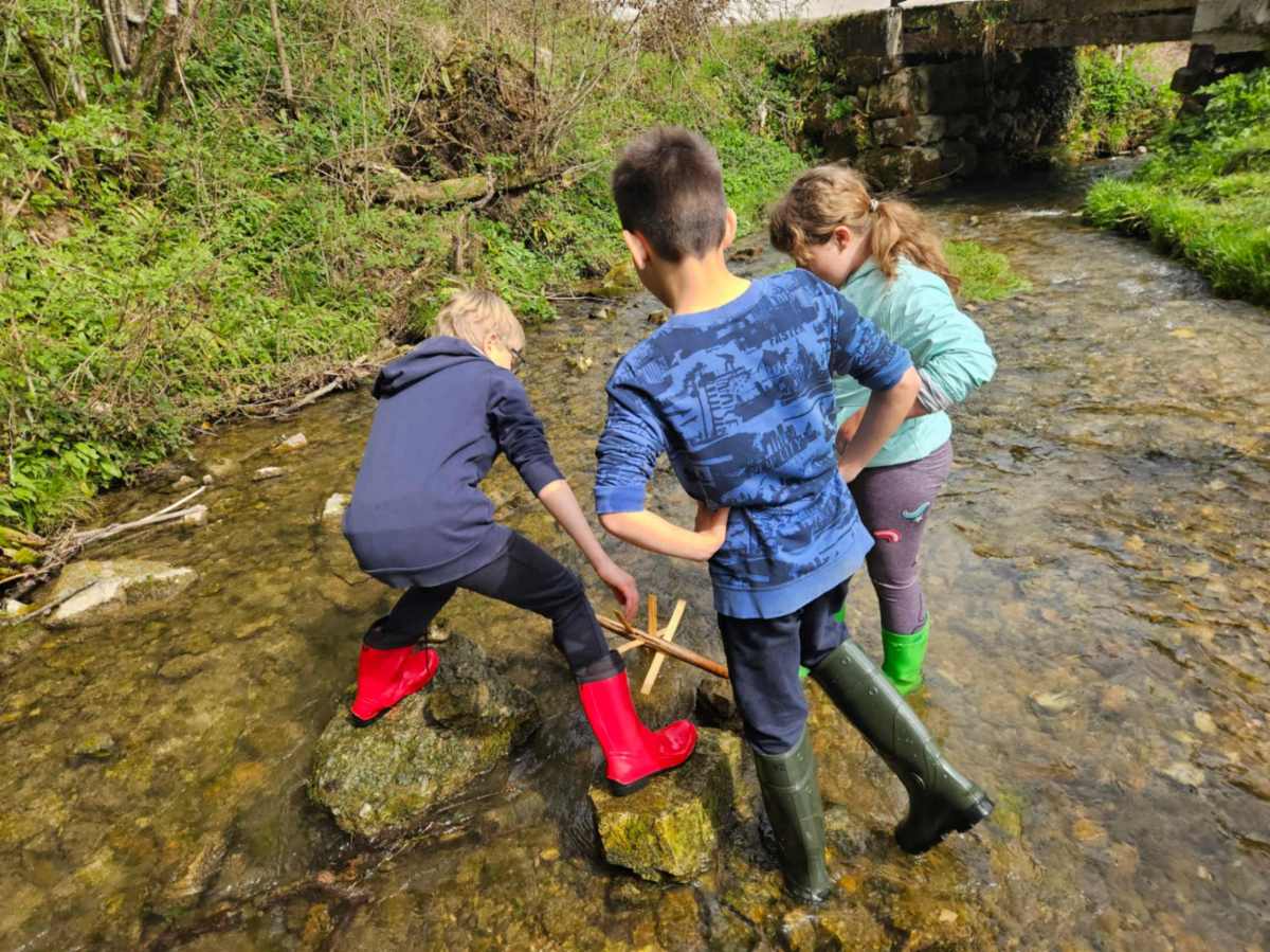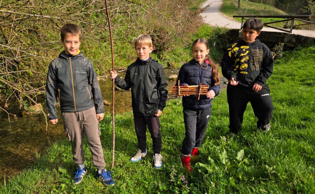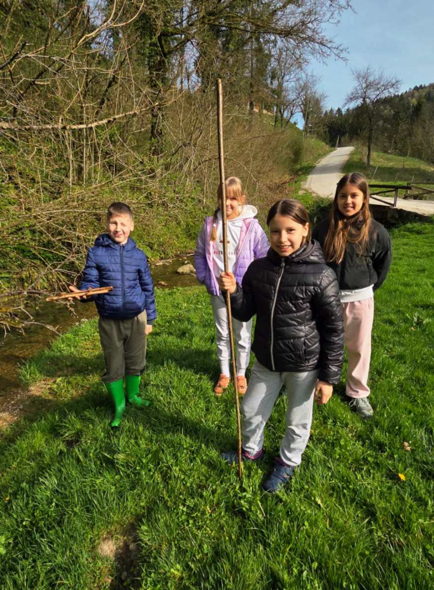 Tam nam je učiteljica najprej razložila, kaj bomo delali. Ideja nam je bila takoj všeč. Razdelili smo se v skupine in začeli po potoku spuščati majhne splave. Eden od učencev v naši ekipi je bil zadolžen za postavitev splava v potok in iz njega. Drugi je bil zadolžen za to, če bi splav zataval, ga bi s palico povlekel k sebi.