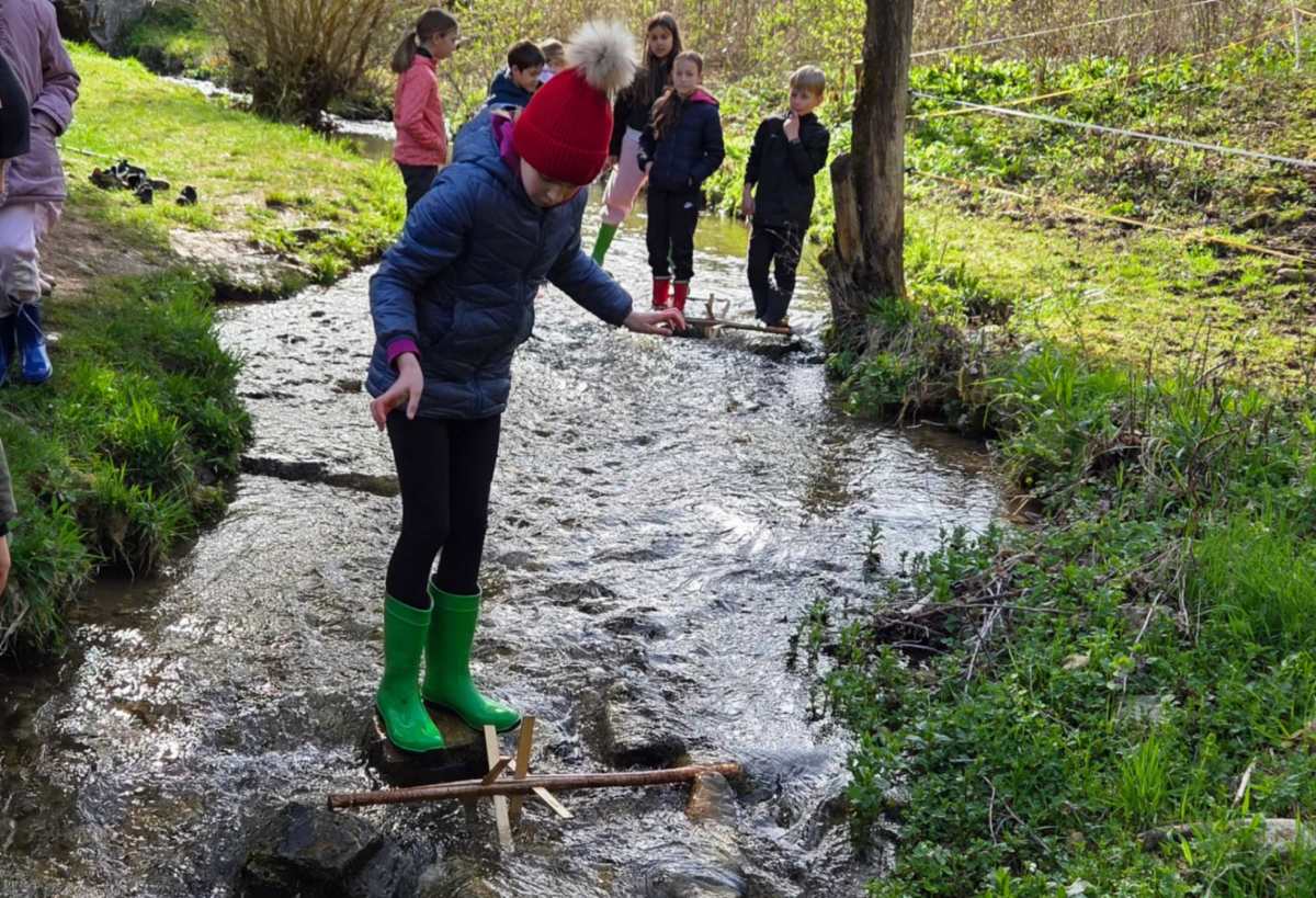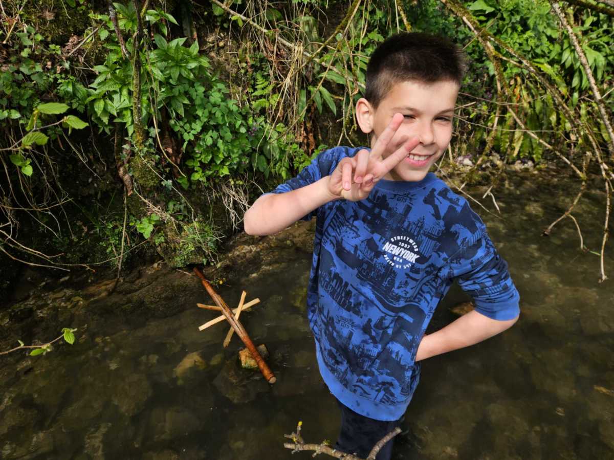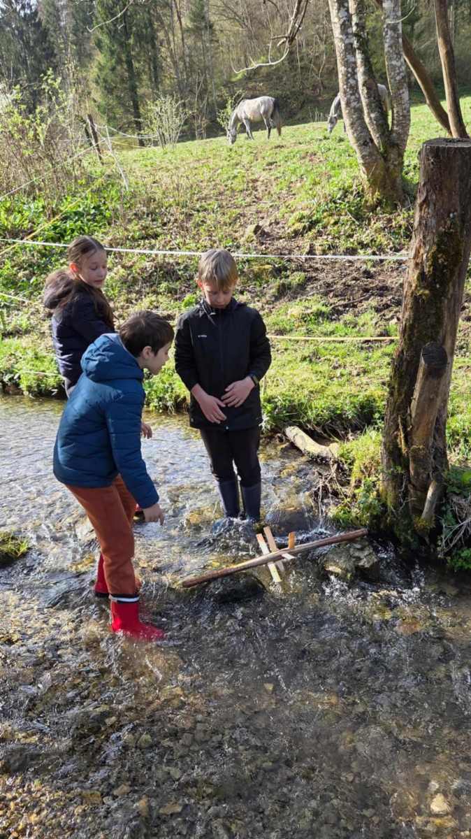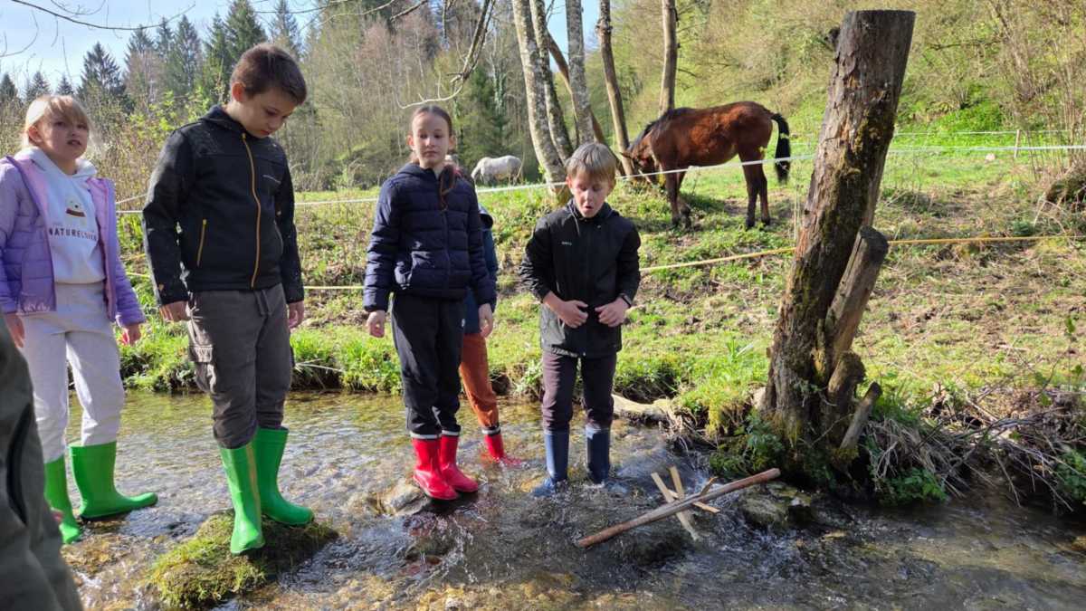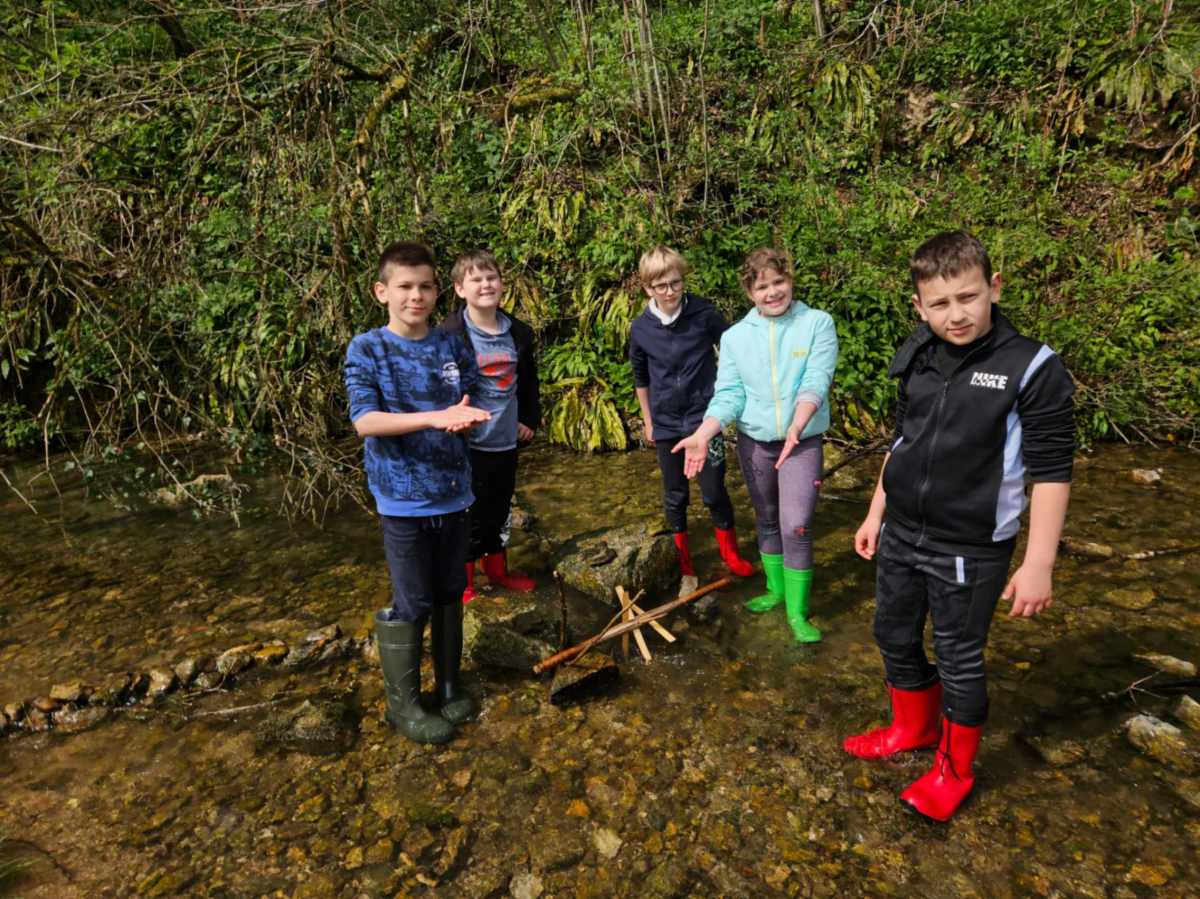 Tam nam je učiteljica najprej razložila, kaj bomo delali. Ideja nam je bila takoj všeč. Razdelili smo se v skupine in začeli po potoku spuščati majhne splave. Eden od učencev v naši ekipi je bil zadolžen za postavitev splava v potok in iz njega. Drugi je bil zadolžen za to, če bi splav zataval, ga bi s palico povlekel k sebi.