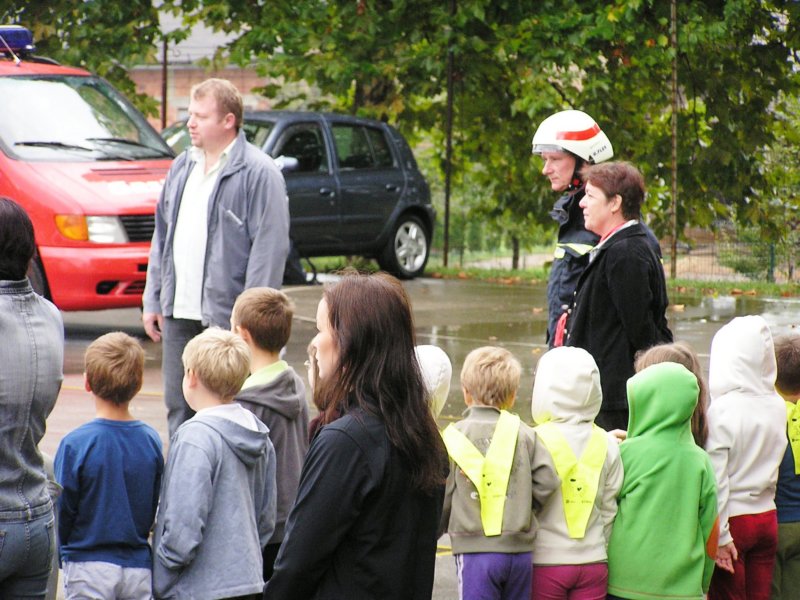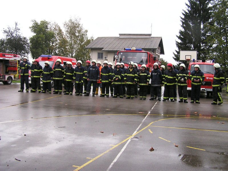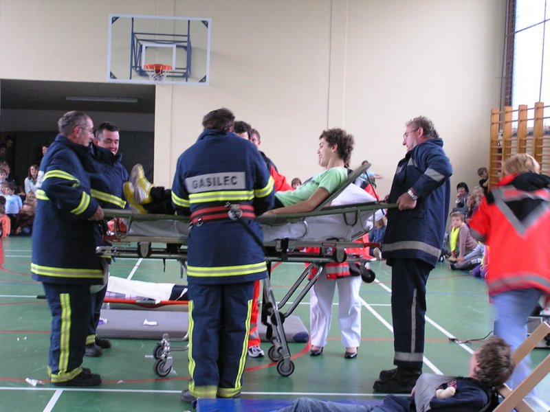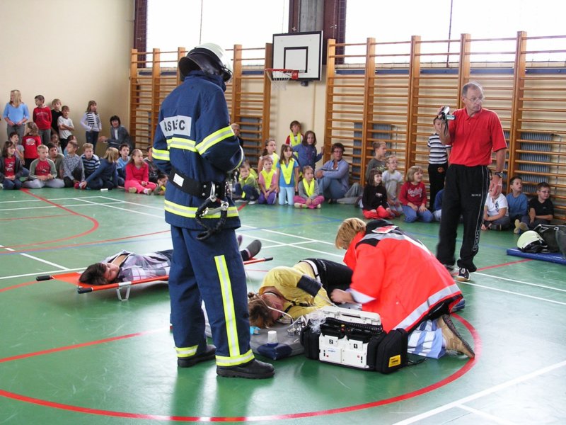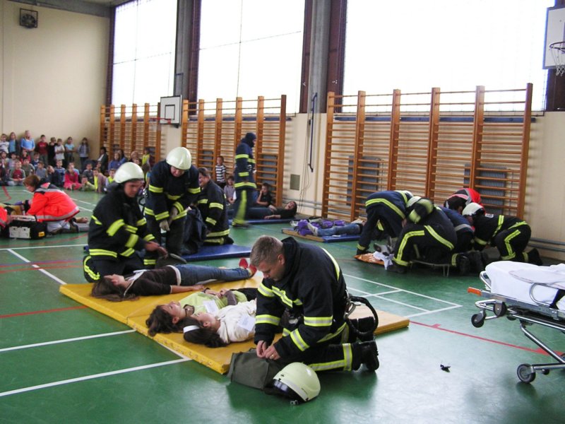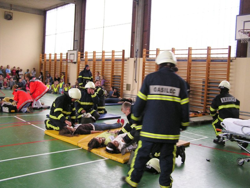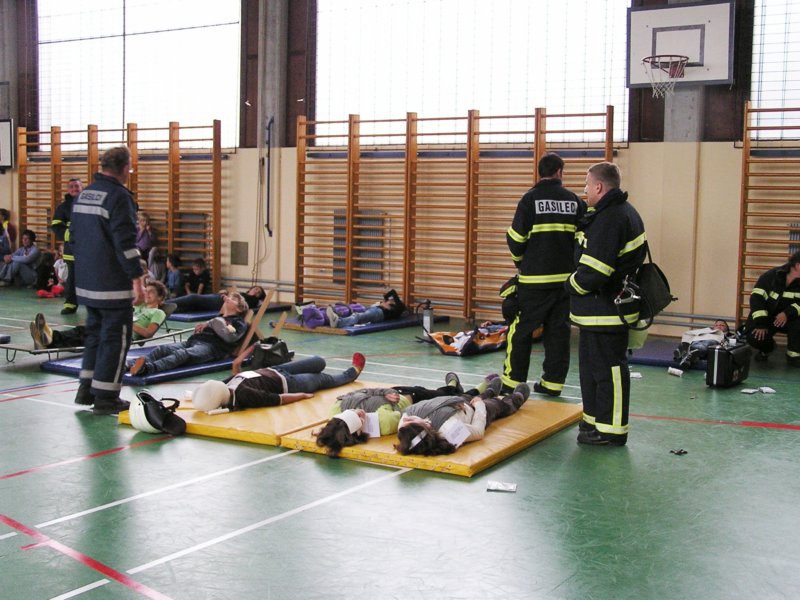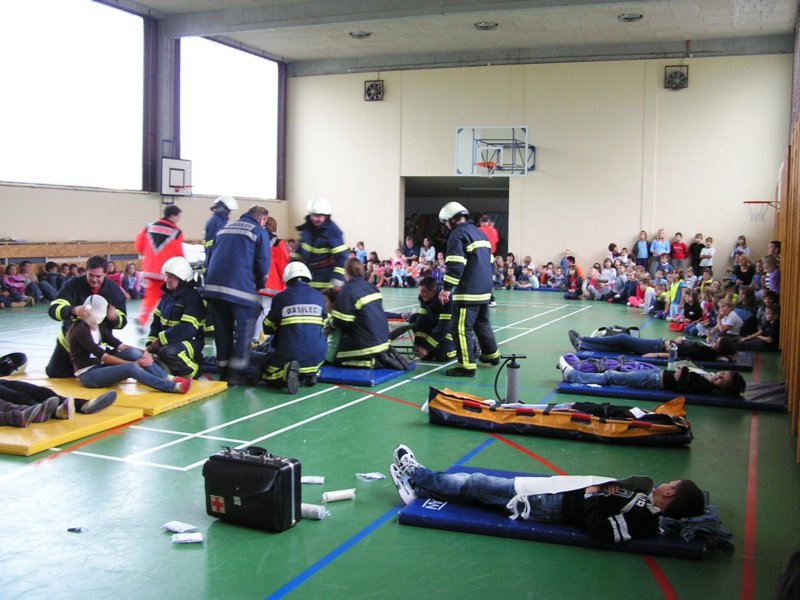 »poškodovance« so gasilci in osebje zdravstvenega doma rešili iz zadimljene učilnice in jih odnesli na varno v telovadnico, saj je zunaj deževalo. Tam so se zbrali vsi učenci, učitelji in vrtec z vzgojiteljicami. S strokovno pomočjo je zdravniško osebje poskrbelo za »poškodovance«. V zadnjem hipu je prišel tudi rešilni avtomobil, ki je demonstriral prevoz do zdravstvenega doma.
