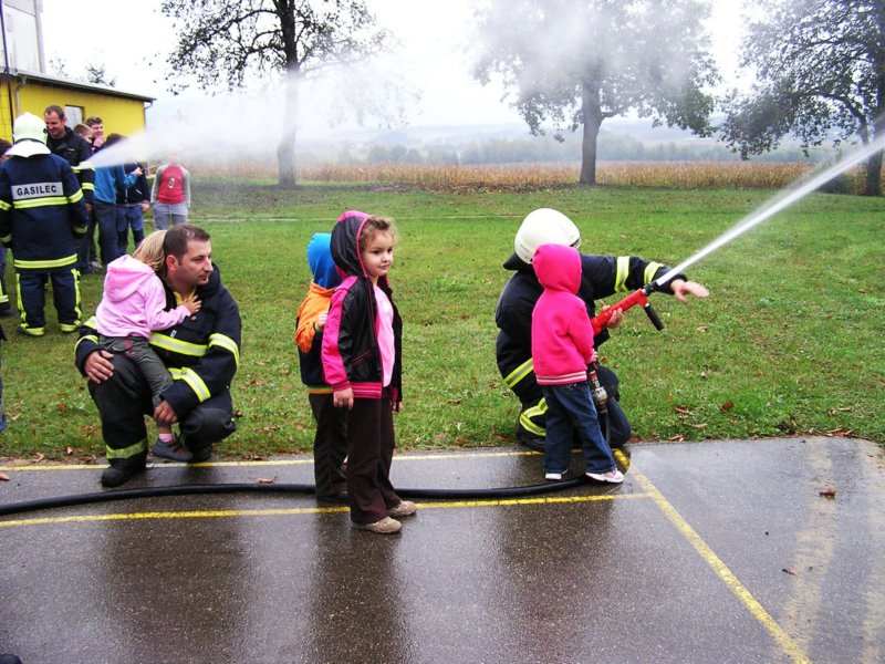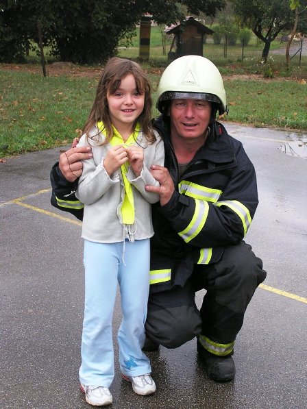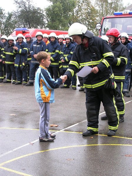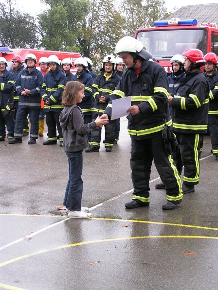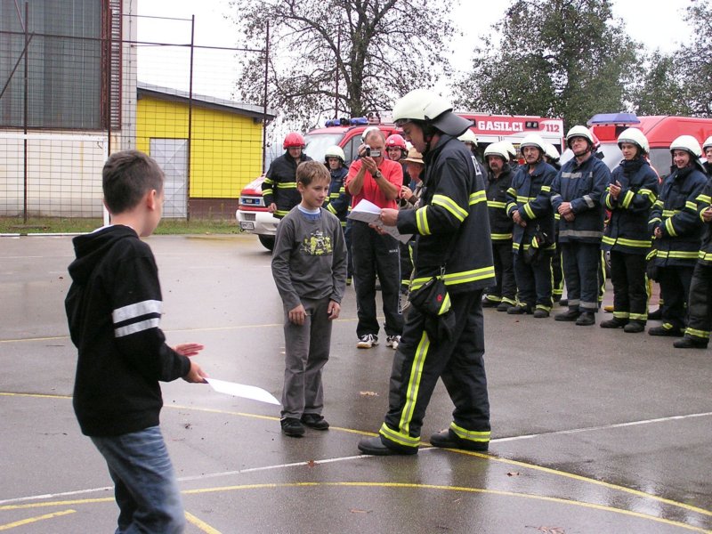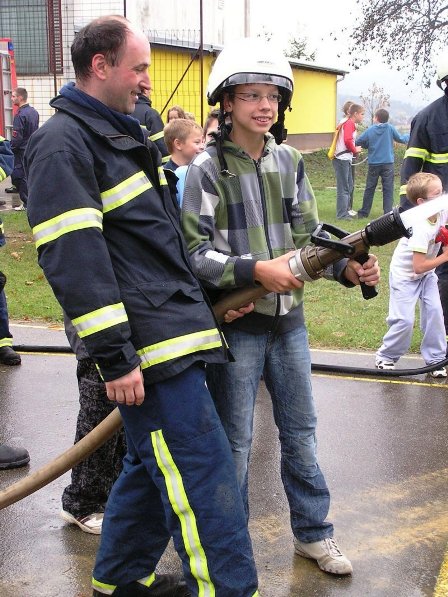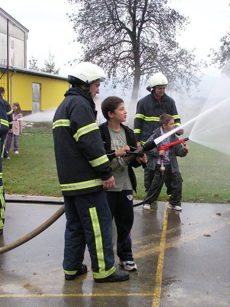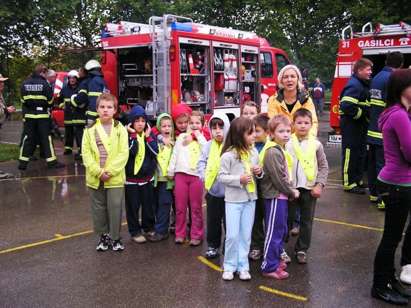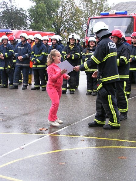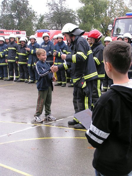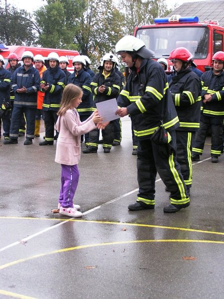 Ko pa je dež ponehal, smo šli vsi iz telovadnice na šolsko igrišče, kjer je poveljnik PGD Dragatuš, g. Marko Štefanič podelil priznanja vsem mladim gasilcem OŠ Dragatuš. Zatem so gasilci PGD Dragatuš, Zapudje, Dobliče, Tanča Gora in Tribuče učencem predstavili svoje gasilske avtomobile. Vsak izmed njih je lahko pomeril tudi plinsko masko ter brizgal z ročnikom. Veseli smo bili, ker je med gasilci bilo tudi veliko očetov, ki so svojim in drugim otrokom pokazali svojo službo.
