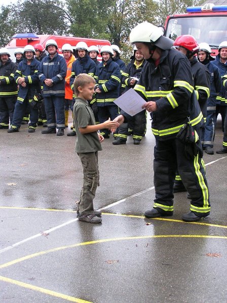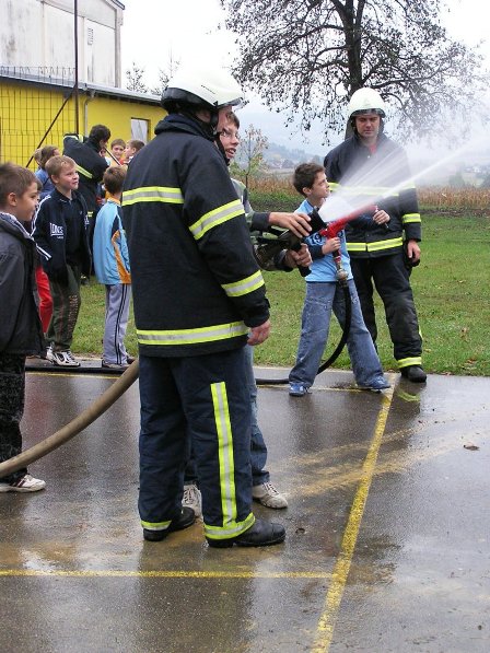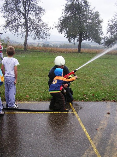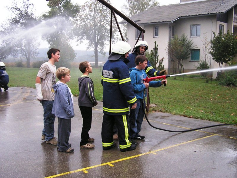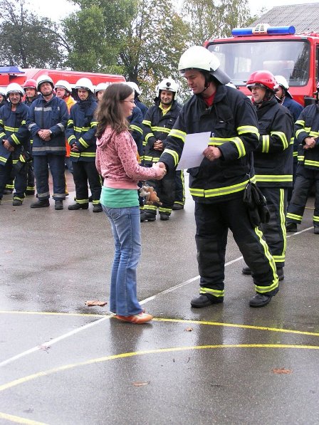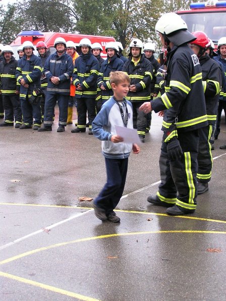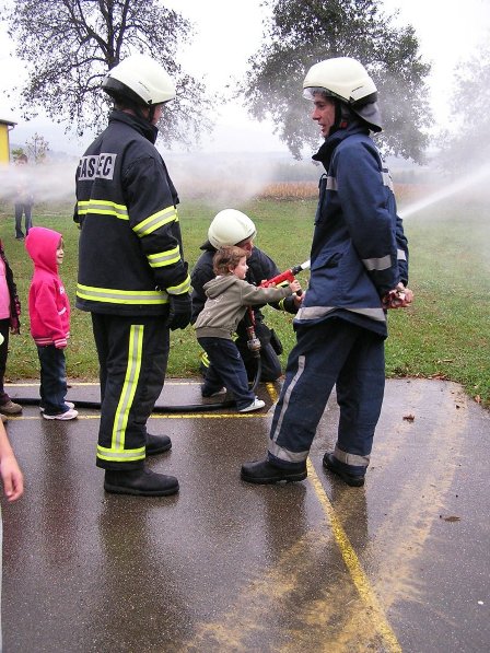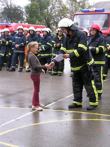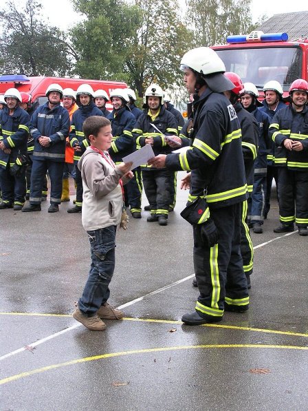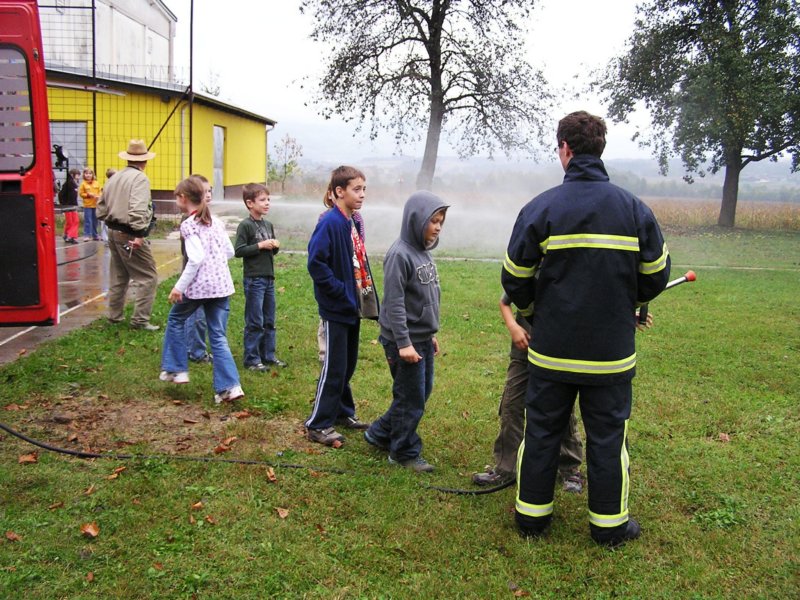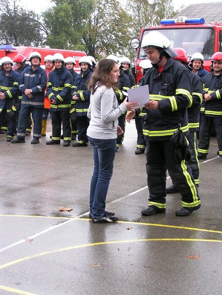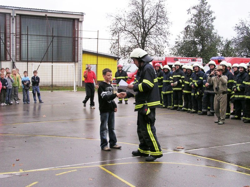 Ko pa je dež ponehal, smo šli vsi iz telovadnice na šolsko igrišče, kjer je poveljnik PGD Dragatuš, g. Marko Štefanič podelil priznanja vsem mladim gasilcem OŠ Dragatuš. Zatem so gasilci PGD Dragatuš, Zapudje, Dobliče, Tanča Gora in Tribuče učencem predstavili svoje gasilske avtomobile. Vsak izmed njih je lahko pomeril tudi plinsko masko ter brizgal z ročnikom. Veseli smo bili, ker je med gasilci bilo tudi veliko očetov, ki so svojim in drugim otrokom pokazali svojo službo.